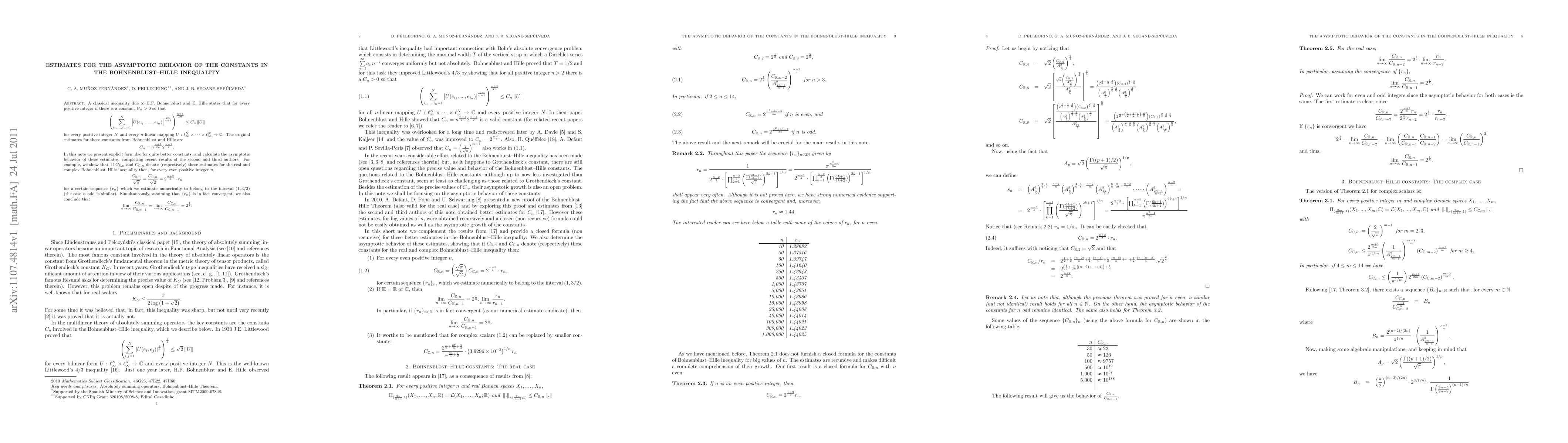 This paper presents improved estimates for the constants in the Bohnenblust-Hille inequality and analyzes their asymptotic behavior. It shows that for even positive integers $n$, the constants $C_{\mathbb{R},n}$ and $C_{\mathbb{C},n}$ are asymptotically proportional to $2^{\frac{n+2}{8}}$ times a sequence $\{r_n\}$, numerically estimated to lie in the interval $(1, 3/2)$.