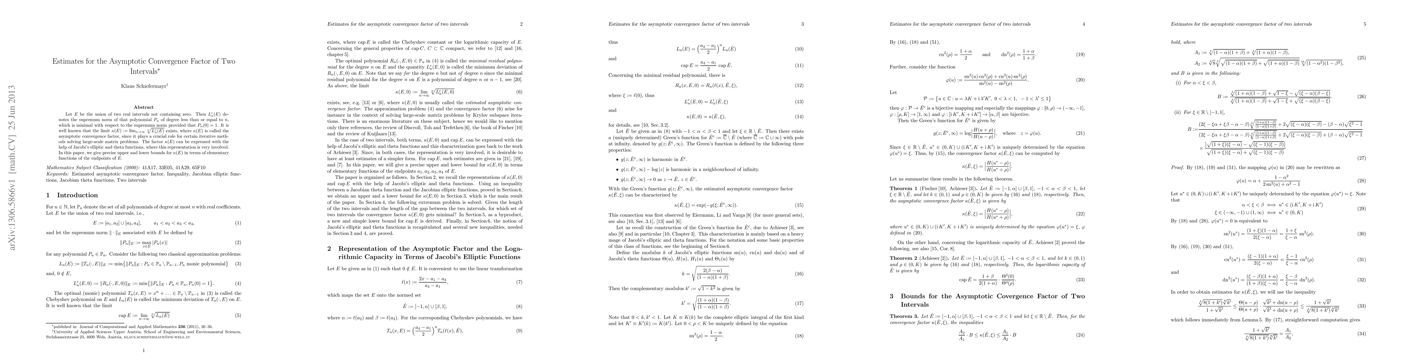 Let $E$ be the union of two real intervals not containing zero. Then $L_n^r(E)$ denotes the supremum norm of that polynomial $P_n$ of degree less than or equal to $n$, which is minimal with respect to the supremum norm provided that $P_n(0)=1$. It is well known that the limit $\kappa(E):=\lim_{n\to\infty}\sqrt[n]{L_n^r(E)}$ exists, where $\kappa(E)$ is called the asymptotic convergence factor, since it plays a crucial role for certain iterative methods solving large-scale matrix problems. The factor $\kappa(E)$ can be expressed with the help of Jacobi's elliptic and theta functions, where this representation is very involved. In this paper, we give precise upper and lower bounds for $\kappa(E)$ in terms of elementary functions of the endpoints of $E$.