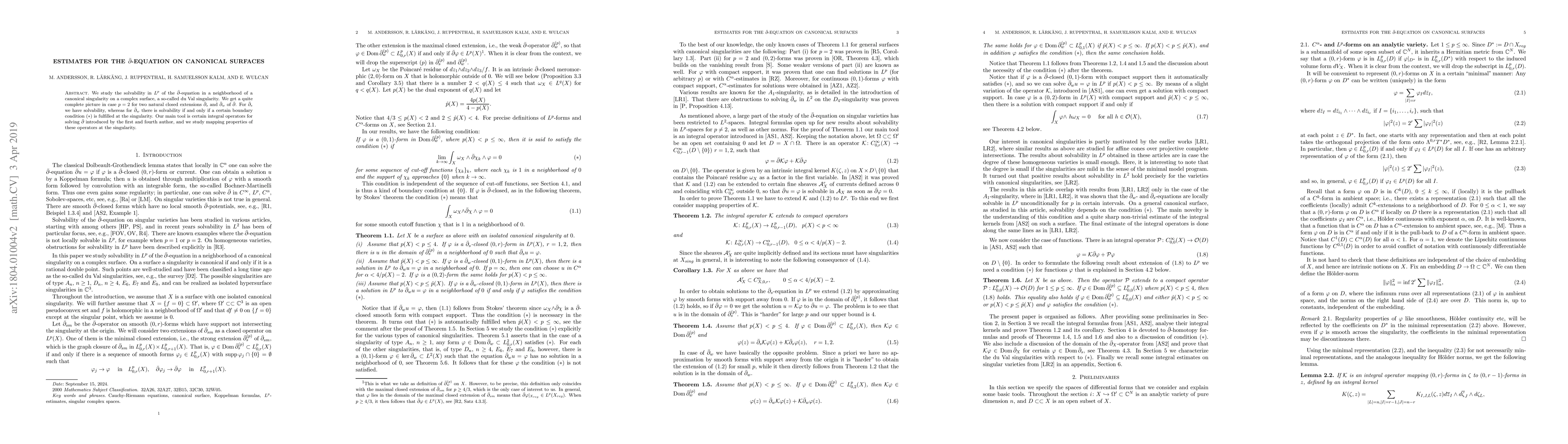 We study the solvability in $L^p$ of the $\bar\partial$-equation in a neighborhood of a canonical singularity on a complex surface, a so-called du Val singularity. We get a quite complete picture in case $p=2$ for two natural closed extensions $\bar\partial_s$ and $\bar\partial_w$ of $\bar\partial$. For $\bar\partial_s$ we have solvability, whereas for $\bar\partial_w$ there is solvability if and only if a certain boundary condition $(*)$ is fulfilled at the singularity. Our main tool is certain integral operators for solving $\bar\partial$ introduced by the first and fourth author, and we study mapping properties of these operators at the singularity.