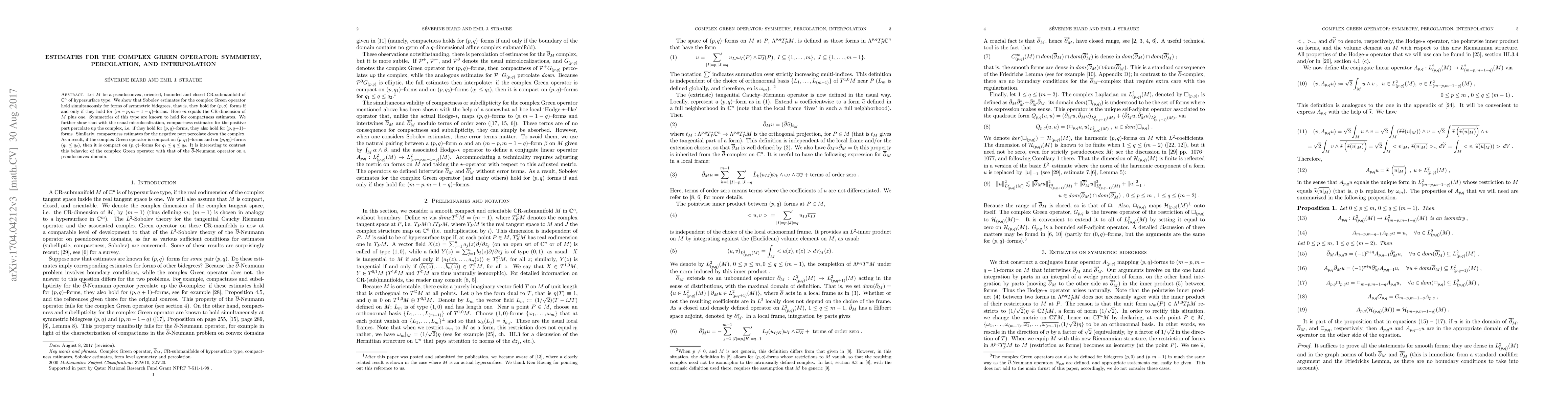 Let $M$ be a pseudoconvex, oriented, bounded and closed CR submanifold of $\mathbb{C}^{n}$ of hypersurface type. We show that Sobolev estimates for the complex Green operator hold simultaneously for forms of symmetric bidegrees, that is, they hold for $(p,q)$--forms if and only if they hold for $(m-p,m-1-q)$--forms. Here $m$ equals the CR dimension of $M$ plus one. Symmetries of this type are known to hold for compactness estimates. We further show that with the usual microlocalization, compactness estimates for the positive part percolate up the complex, i.e. if they hold for $(p,q)$--forms, they also hold for $(p,q+1)$--forms. Similarly, compactness estimates for the negative part percolate down the complex. As a result, if the complex Green operator is compact on $(p,q_{1})$--forms and on $(p,q_{2})$--forms ($q_{1}\leq q_{2}$), then it is compact on $(p,q)$--forms for $q_{1}\leq q\leq q_{2}$. It is interesting to contrast this behavior of the complex Green operator with that of the $\overline{\partial}$--Neumann operator on a pseudoconvex domain.