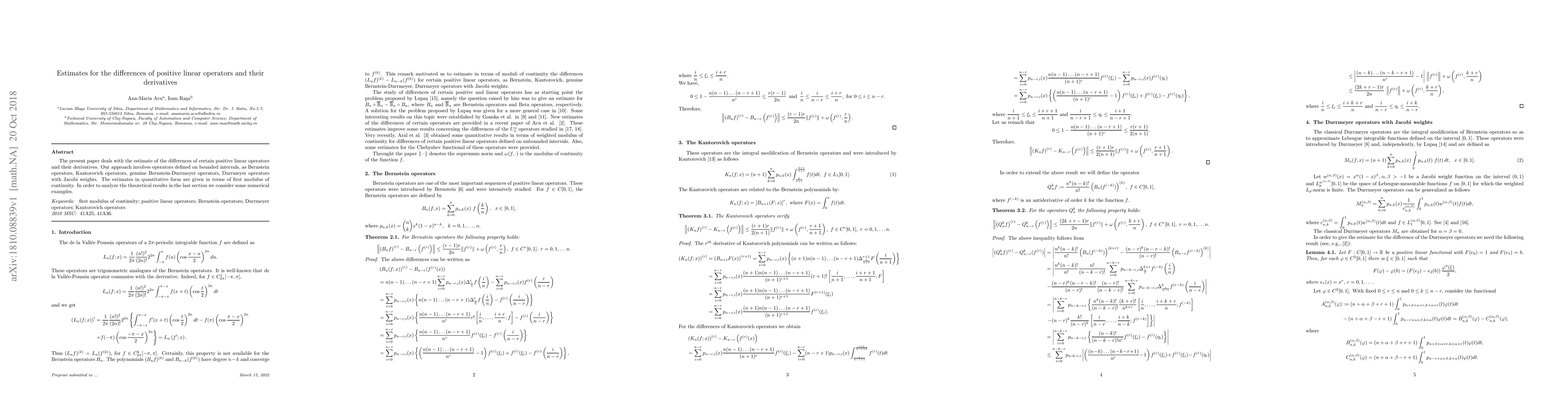 The present paper deals with the estimate of the differences of certain positive linear operators and their derivatives. Our approach involves operators defined on bounded intervals, as Bernstein operators, Kantorovich operators, genuine Bernstein-Durrmeyer operators, Durrmeyer operators with Jacobi weights. The estimates in quantitative form are given in terms of first modulus of continuity. In order to analyze the theoretical results in the last section we consider some numerical examples.