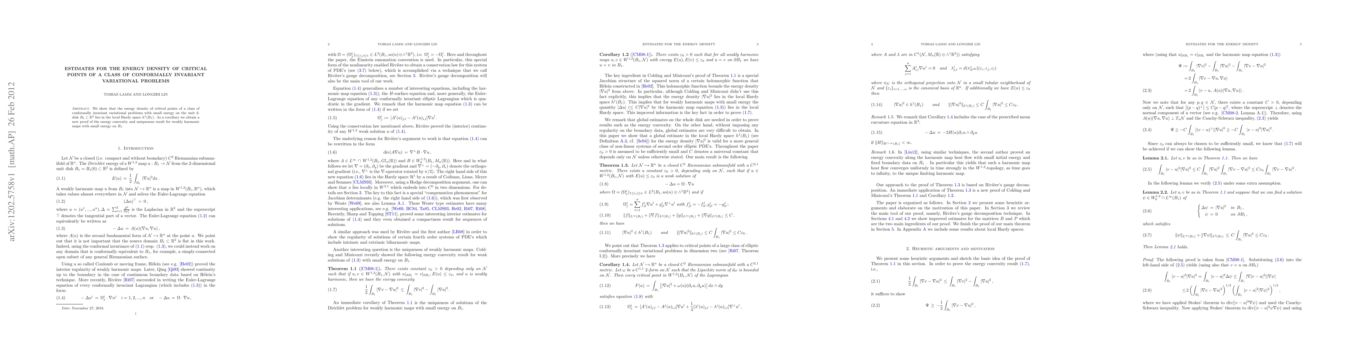 We show that the energy density of critical points of a class of conformally invariant variational problems with small energy on the unit 2-disk B_1 lies in the local Hardy space h^1(B_1). As a corollary we obtain a new proof of the energy convexity and uniqueness result for weakly harmonic maps with small energy on B_1.