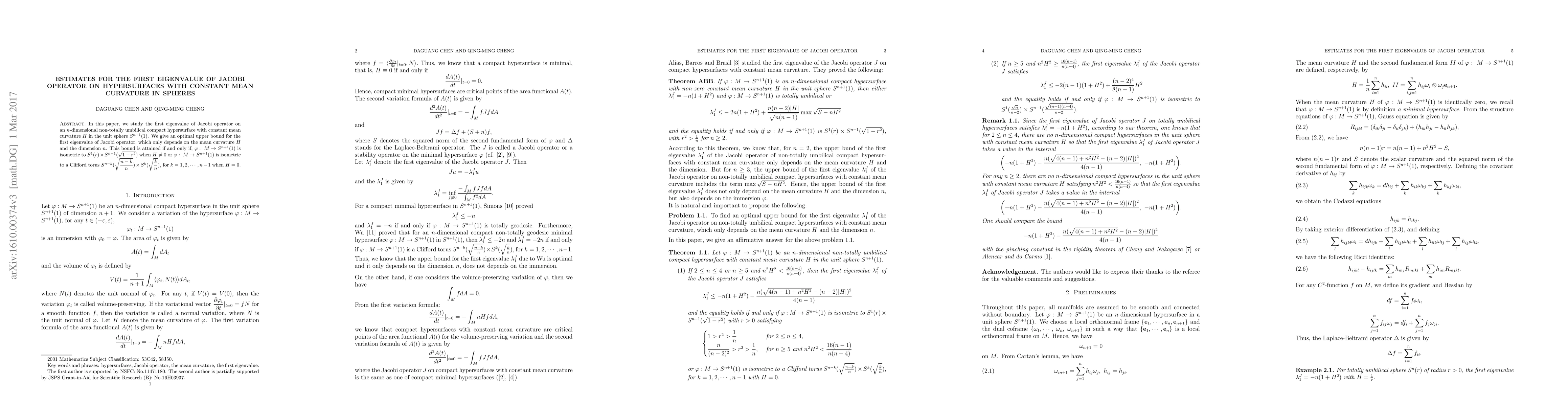 This paper provides an optimal upper bound for the first eigenvalue of the Jacobi operator on $n$-dimensional hypersurfaces with constant mean curvature in the unit sphere, depending solely on the mean curvature $H$ and the dimension $n$. The results are derived for non-totally umbilical compact hypersurfaces.