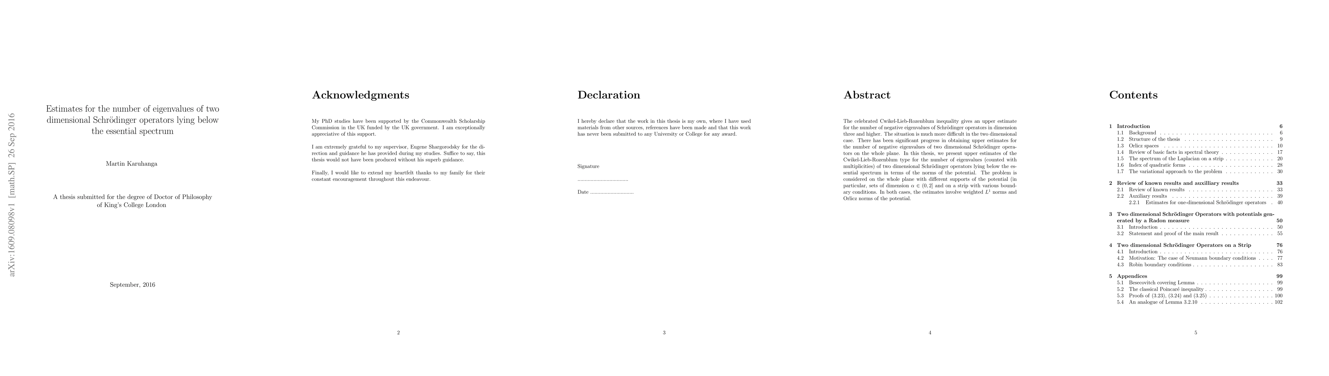 The celebrated Cwikel-Lieb_Rozenblum inequality gives an upper estimate for the number of negative eigenvalues of Schroedinger operators in dimension three and higher. The situation is much more difficult in the two dimensional case. There has been significant progress in obtaining upper estimates for the number of negative eigenvalues of two dimensional Schroedinger operators on the whole plane. In this thesis, we present estimates of the Cwikel-Lieb_Rozenblum type for the number of eigenvalues (counted with multiplicities) of two dimensional Schroedinger operators lying below the essential spectrum in terms of the norms of the potential. The problem is considered on the whole plane with different supports of the potential of dimension between 0 and 2, and on a strip with various boundary conditions. In both cases, the estimates involve weighted L^1 norms and Orlicz norms of the potential.