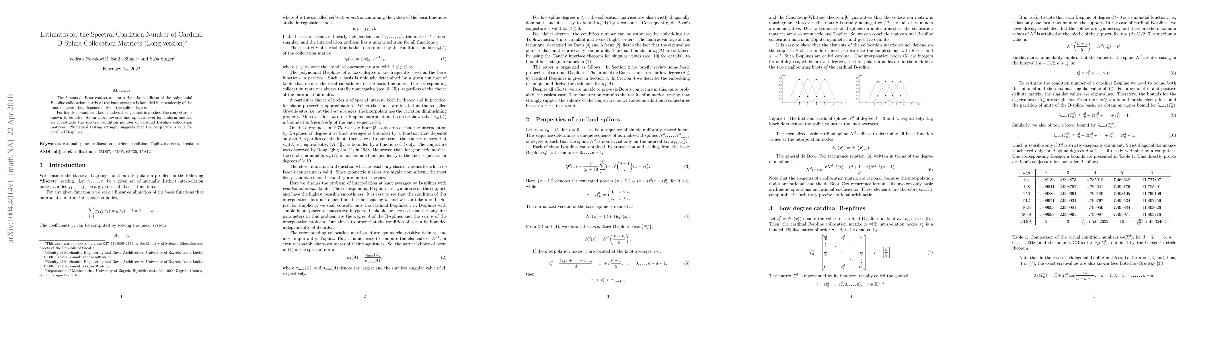Summary: This paper investigates the spectral condition number of cardinal B-spline collocation matrices to test the de Boor conjecture, which posits that the condition number is independent of the knot sequence for uniform meshes. Numerical results suggest the conjecture holds true for cardinal B-splines.