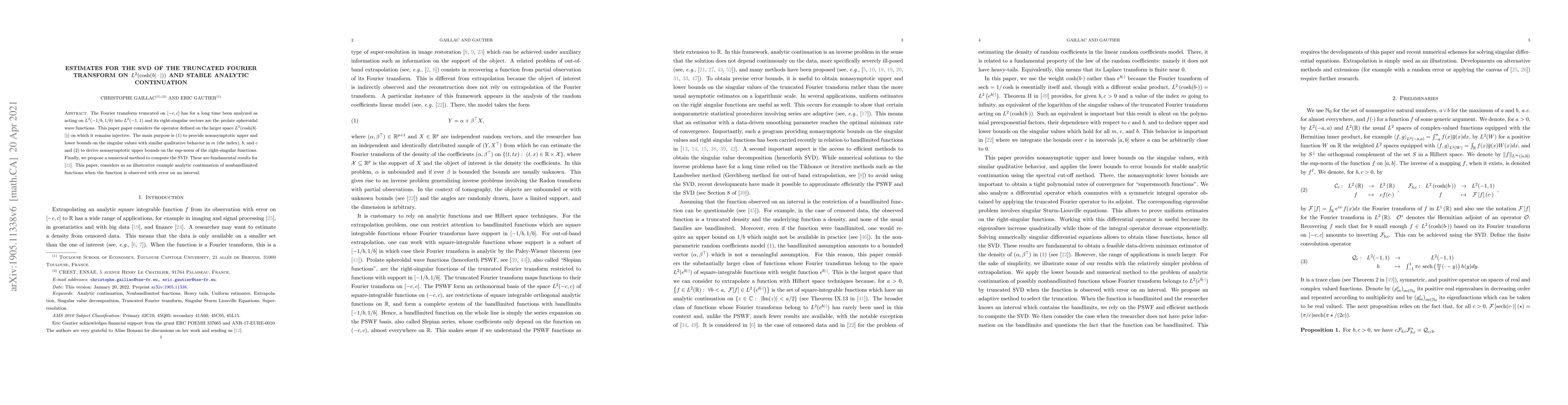 This paper provides nonasymptotic bounds for the singular values of the truncated Fourier transform acting on L^2(exp(b|.|)), extending the analysis beyond the usual L^2(-1/b,1/b) space. It also establishes convergence rates for stable analytic continuation of nonbandlimited functions and proposes a numerical method for computing the SVD.