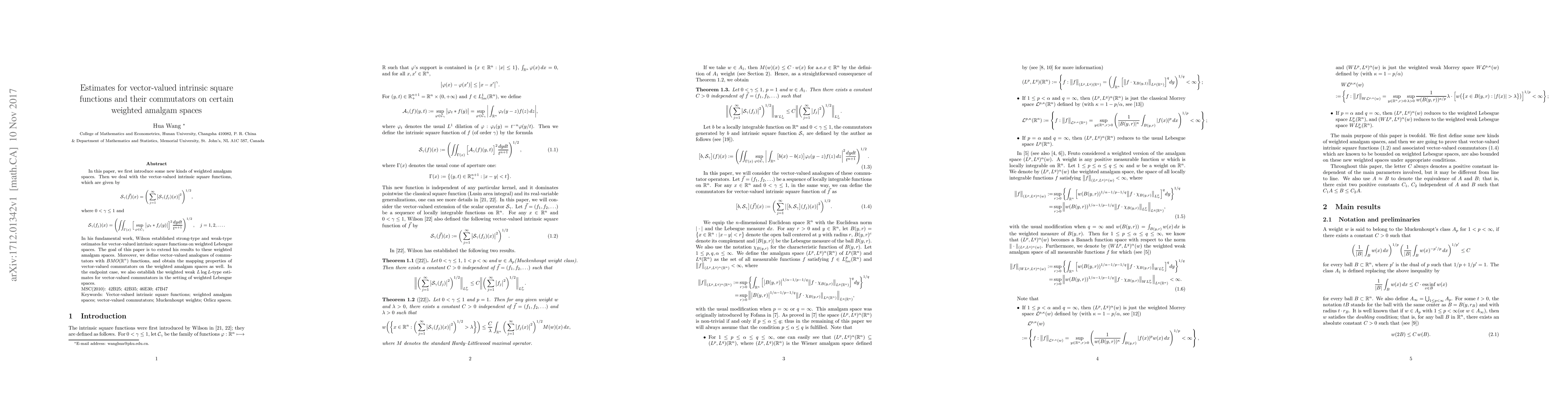 This paper introduces new weighted amalgam spaces and extends Wilson's estimates for vector-valued intrinsic square functions to these spaces. It also defines vector-valued commutators with $BMO(\mathbb R^n)$ functions and establishes their mapping properties on the weighted amalgam spaces, including weighted weak $L\log L$-type estimates for the commutators.