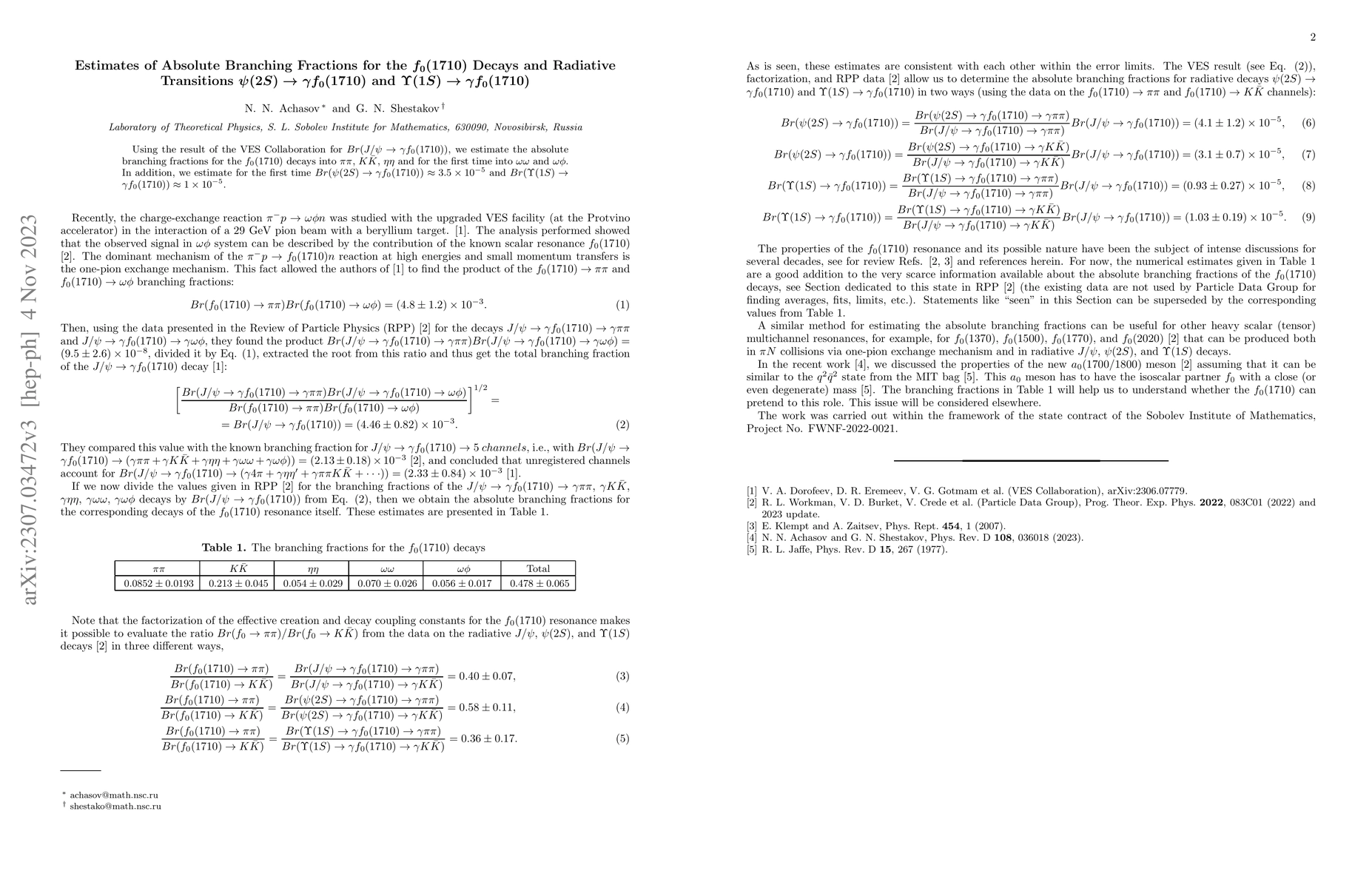This paper estimates the absolute branching fractions for the $f_0(1710)$ decays into various meson pairs and determines the radiative transition branching fractions for $\psi(2S)\to\gamma f_0(1710)$ and $\Upsilon(1S)\to\gamma f_0(1710)$. The results are based on the VES Collaboration's findings for $Br(J/\psi\to\gamma f_0(1710))$.