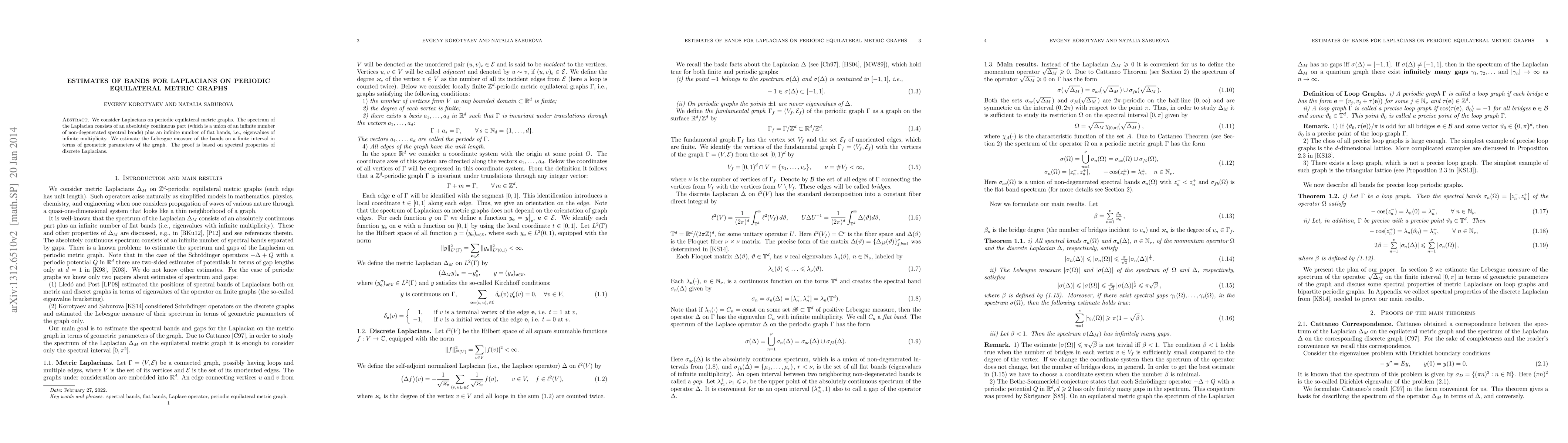This paper estimates the Lebesgue measure of spectral bands for Laplacians on periodic equilateral metric graphs, showing that the spectrum comprises continuous bands and flat bands. The estimates are derived using the geometric parameters of the graph and spectral properties of discrete Laplacians.