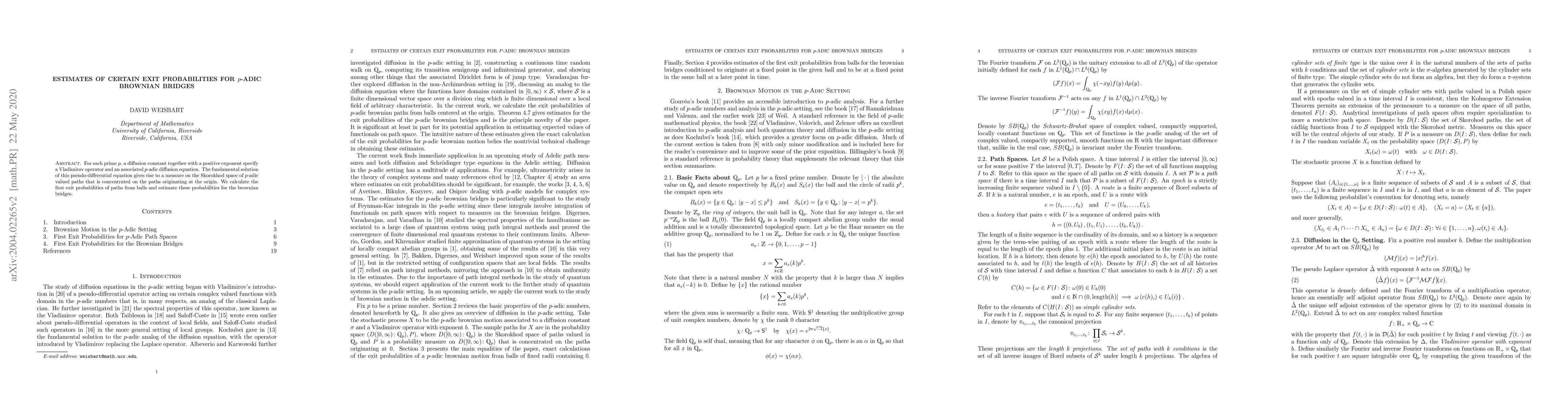 For each prime $p$, a diffusion constant together with a positive exponent specify a Vladimirov operator and an associated $p$-adic diffusion equation. The fundamental solution of this pseudo-differential equation gives rise to a measure on the Skorokhod space of $p$-adic valued paths that is concentrated on the paths originating at the origin. We calculate the first exit probabilities of paths from balls and estimate these probabilities for the brownian bridges.