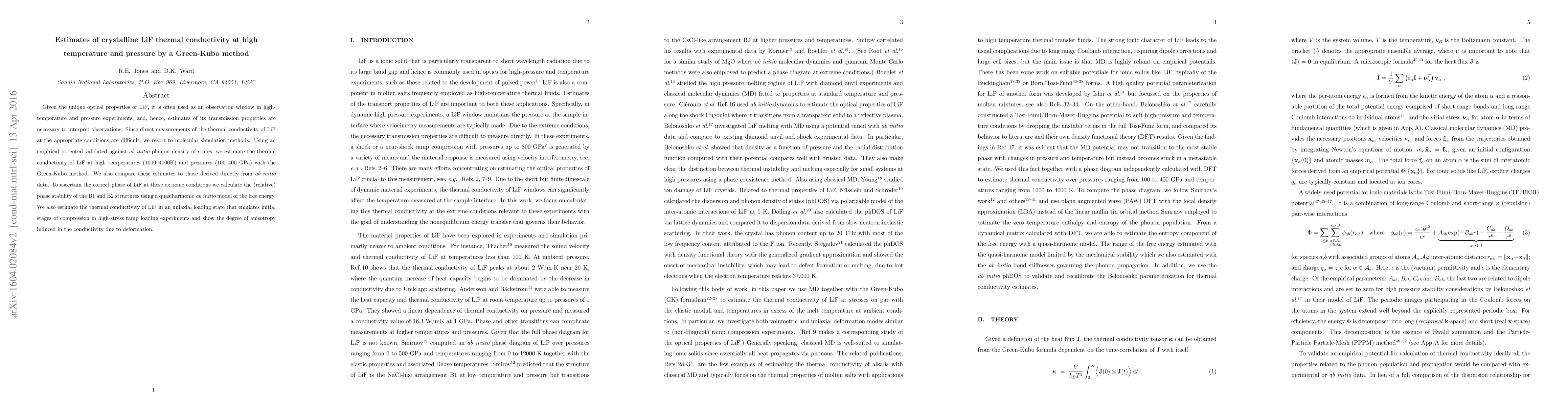 Given the unique optical properties of LiF, it is often used as an observation window in high-temperature and pressure experiments; and, hence, estimates of its transmission properties are necessary to interpret observations. Since direct measurements of the thermal conductivity of LiF at the appropriate conditions are difficult, we resort to molecular simulation methods. Using the Belonoshko et al. (2000) empirical potential validated against ab initio phonon density of states, we estimate the thermal conductivity of LiF at high temperatures (1000-4000K) and pressures (100-400 GPa) with the Green-Kubo method. We also compare these estimates to those derived directly from ab initio data. To ascertain the correct phase of LiF at these extreme conditions we calculate the (relative) phase stability of the B1 and B2 structures using a quasiharmonic ab initio model of the free energy. We also estimate the thermal conductivity of LiF in an uniaxial loading state that emulates initial stages of compression in high-stress ramp loading experiments and show the degree of anisotropy induced in the conductivity due to deformation.