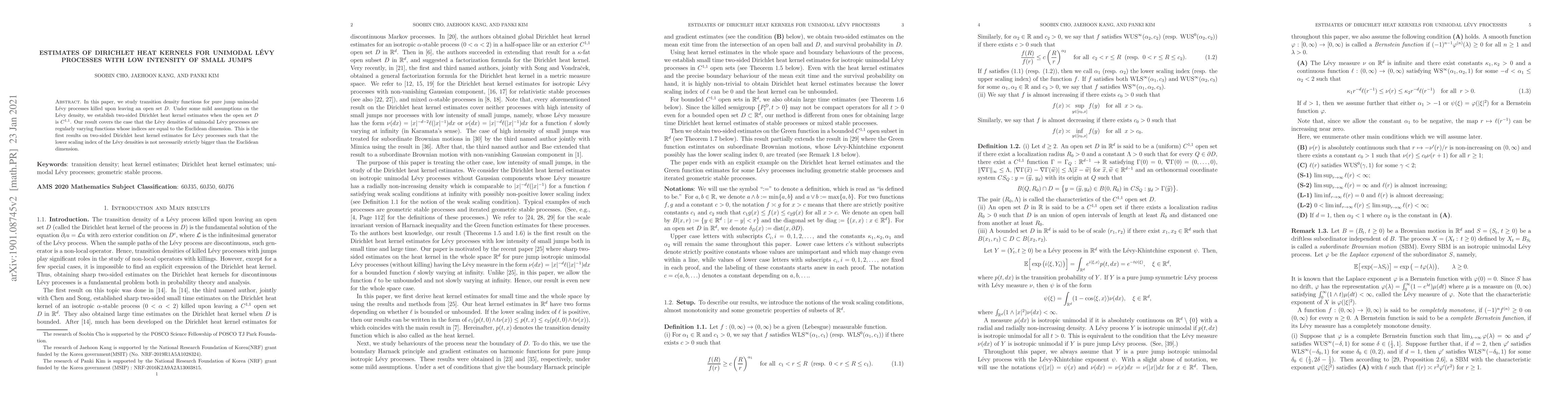 This paper establishes two-sided Dirichlet heat kernel estimates for pure jump unimodal Lévy processes with low intensity of small jumps, focusing on processes killed upon leaving a $C^{1, 1}$ open set $D$. The results apply even when the Lévy densities' weak lower scaling index equals the Euclidean dimension.