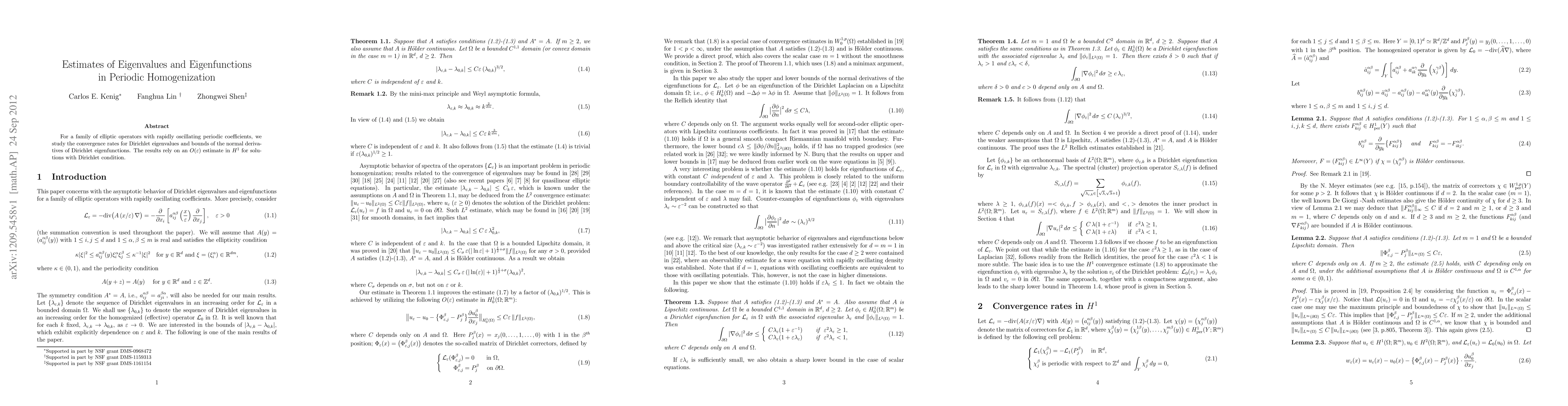 This paper investigates the convergence rates for Dirichlet eigenvalues and eigenfunctions of elliptic operators with rapidly oscillating periodic coefficients, utilizing an $O(\epsilon)$ estimate in $H^1$ for solutions under Dirichlet conditions. The findings provide bounds on the normal derivatives of the eigenfunctions.