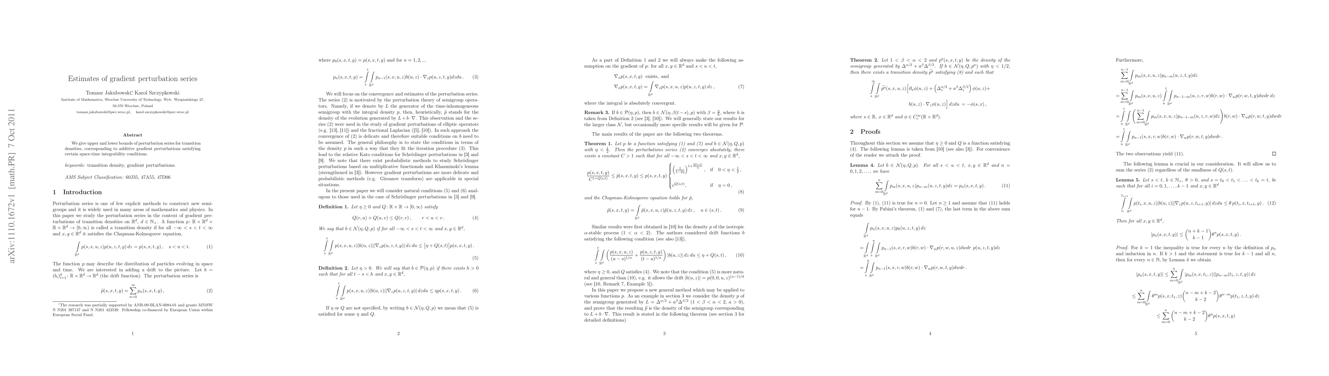 We give upper and lower bounds of perturbation series for transition densities, corresponding to additive gradient perturbations satisfying certain space-time integrability conditions.