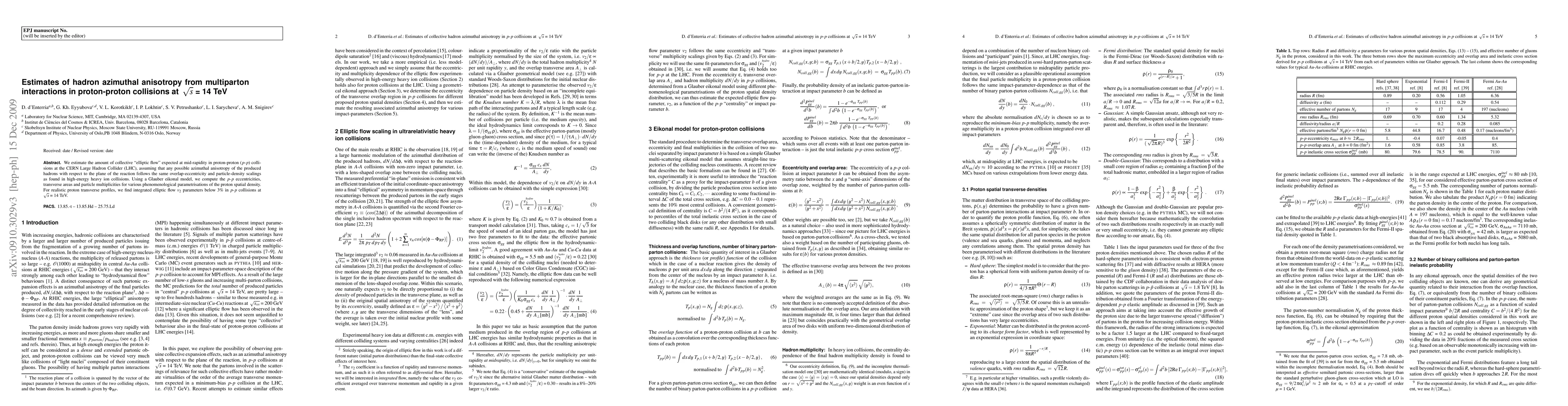 This study estimates the collective "elliptic flow" in proton-proton collisions at 14 TeV, finding integrated elliptic flow v2 parameters below 3%. The analysis uses a Glauber eikonal model to compute eccentricities and particle multiplicities based on various proton spatial density models.