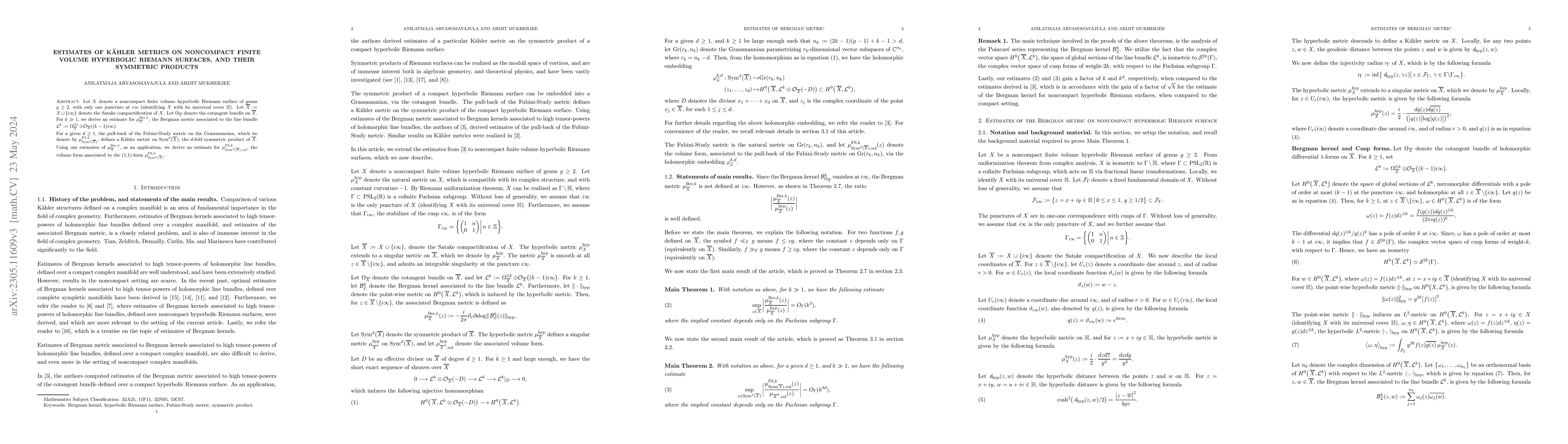 Let $X$ denote a noncompact finite volume hyperbolic Riemann surface of genus $g\geq 2$, with only one puncture at $i\infty$ (identifying $X$ with its universal cover $\mathbb{H}$). Let $\overline{X}:=X\cup\lbrace i\infty\rbrace$ denote the Satake compactification of $X$. Let $\Omega_{\overline{X}}$ denote the cotangent bundle on $\overline{X}$. For $k\gg1$, we derive an estimate for $\mu_{\overline{X}}^{\mathrm{Ber},k}$, the Bergman metric associated to the line bundle $\mathcal{L}^{k}:=\Omega_{\overline{X}}\otimes \mathcal{O}_{\overline{X}}\big((k-1)\infty\big)$. For a given $d\geq 1$, the pull-back of the Fubini-Study metric on the Grassmannian, which we denote by $\mu_{\mathrm{Sym}^d(\overline{X})}^{\mathrm{FS},k}$, defines a K\"ahler metric on $\mathrm{Sym}^d(\overline{X})$, the $d$-fold symmetric product of $\overline{X}$. Using our estimates of $\mu_{\overline{X}}^{\mathrm{Ber},k}$, as an application, we derive an estimate for $\mu_{\mathrm{Sym}^d(\overline{X}),\mathrm{vol}}^{\mathrm{FS},k}$, the volume form associated to the (1,1)-form $\mu_{\mathrm{Sym}^d(\overline{X})}^{\mathrm{FS},k}$.