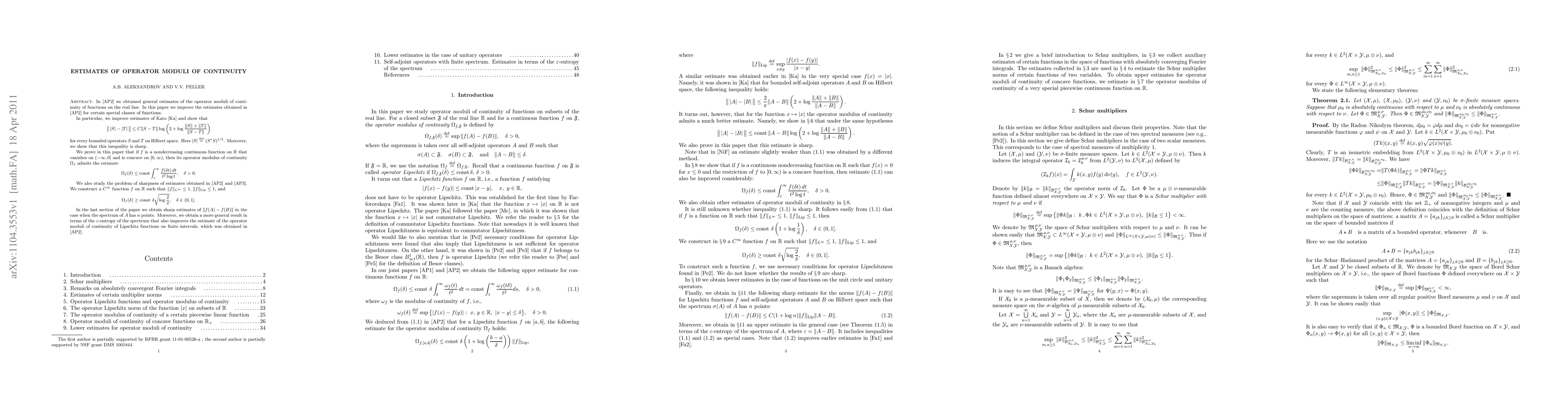 This paper refines estimates of operator moduli of continuity for specific classes of functions, improving previous results by showing that $\big\|\,|S|-|T|\,\big\|\le C\|S-T\|\log(2+\log\frac{\|S\|+\|T\|}{\|S-T\|})$ for bounded operators $S$ and $T$ on a Hilbert space, and proving the sharpness of this inequality. The paper also provides a new estimate for the operator modulus of continuity of certain nondecreasing continuous functions.