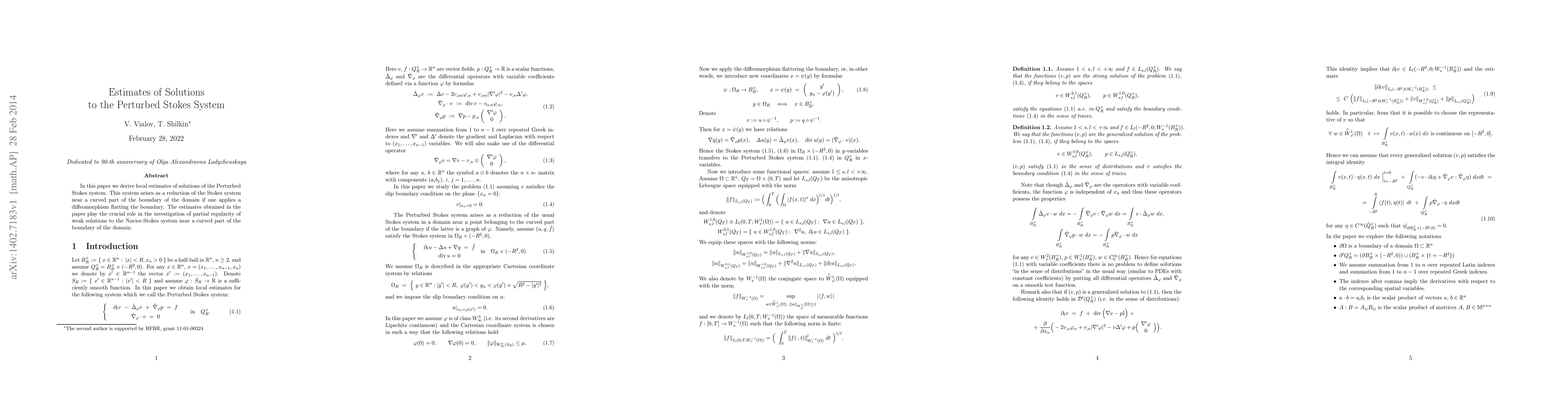 In this paper we derive local estimates of solutions of the Perturbed Stokes system. This system arises as a reduction of the Stokes system near a curved part of the boundary of the domain if one applies a diffeomorphism flatting the boundary. The estimates obtained in the paper play the crucial role in the investigation of partial regularity of weak solutions to the Navier-Stokes system near a curved part of the boundary of the domain.