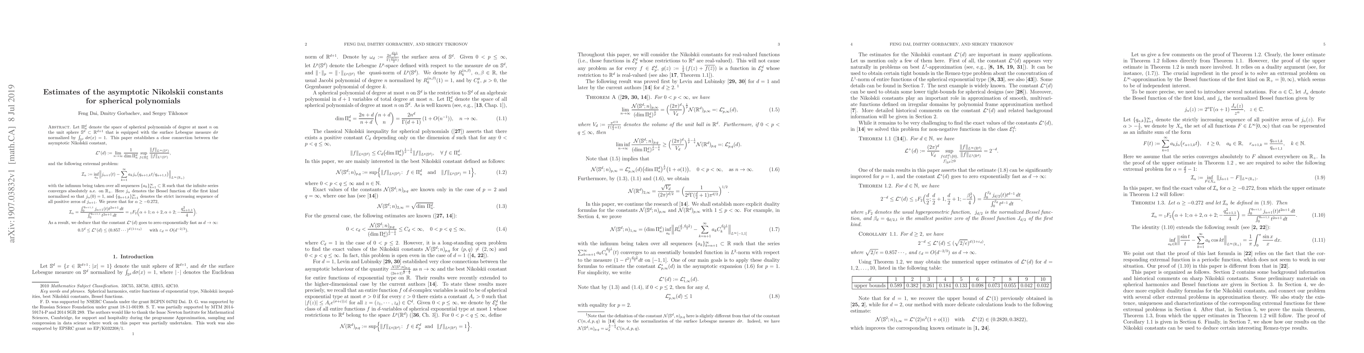 Let $\Pi_n^d$ denote the space of spherical polynomials of degree at most $n$ on the unit sphere $\mathbb{S}^d\subset \mathbb{R}^{d+1}$ that is equipped with the surface Lebesgue measure $d\sigma$ normalized by $\int_{\mathbb{S}^d} \, d\sigma(x)=1$. This paper establishes a close connection between the asymptotic Nikolskii constant, $$ \mathcal{L}^\ast(d):=\lim_{n\to \infty} \frac 1 {\dim \Pi_n^d} \sup_{f\in \Pi_n^d} \frac { \|f\|_{L^\infty(\mathbb{S}^d)}}{\|f\|_{L^1(\mathbb{S}^d)}},$$ and the following extremal problem: $$ \mathcal{I}_\alpha:=\inf_{a_k} \Bigl\| j_{\alpha+1} (t)- \sum_{k=1}^\infty a_k j_{\alpha} \bigl( q_{\alpha+1,k}t/q_{\alpha+1,1}\bigr)\Bigr\|_{L^\infty(\mathbb{R}_+)} $$ with the infimum being taken over all sequences $\{a_k\}_{k=1}^\infty\subset \mathbb{R}$ such that the infinite series converges absolutely a.e. on $\mathbb{R}_+$. Here $j_\alpha $ denotes the Bessel function of the first kind normalized so that $j_\alpha(0)=1$, and $\{q_{\alpha+1,k}\}_{k=1}^\infty$ denotes the strict increasing sequence of all positive zeros of $j_{\alpha+1}$. We prove that for $\alpha\ge -0.272$, $$\mathcal{I}_\alpha= \frac{\int_{0}^{q_{\alpha+1,1}}j_{\alpha+1}(t)t^{2\alpha+1}\,dt}{\int_{0}^{q_{\alpha+1,1}}t^{2\alpha+1}\,dt}= {}_{1}F_{2}\Bigl(\alpha+1;\alpha+2,\alpha+2;-\frac{q_{\alpha+1,1}^{2}}{4}\Bigr). $$ As a result, we deduce that the constant $\mathcal{L}^\ast(d)$ goes to zero exponentially fast as $d\to\infty$: \[ 0.5^d\le \mathcal{L}^{*}(d)\le (0.857\cdots)^{d\,(1+\varepsilon_d)} \ \ \ \ \ \text{with $\varepsilon_d =O(d^{-2/3})$.} \]