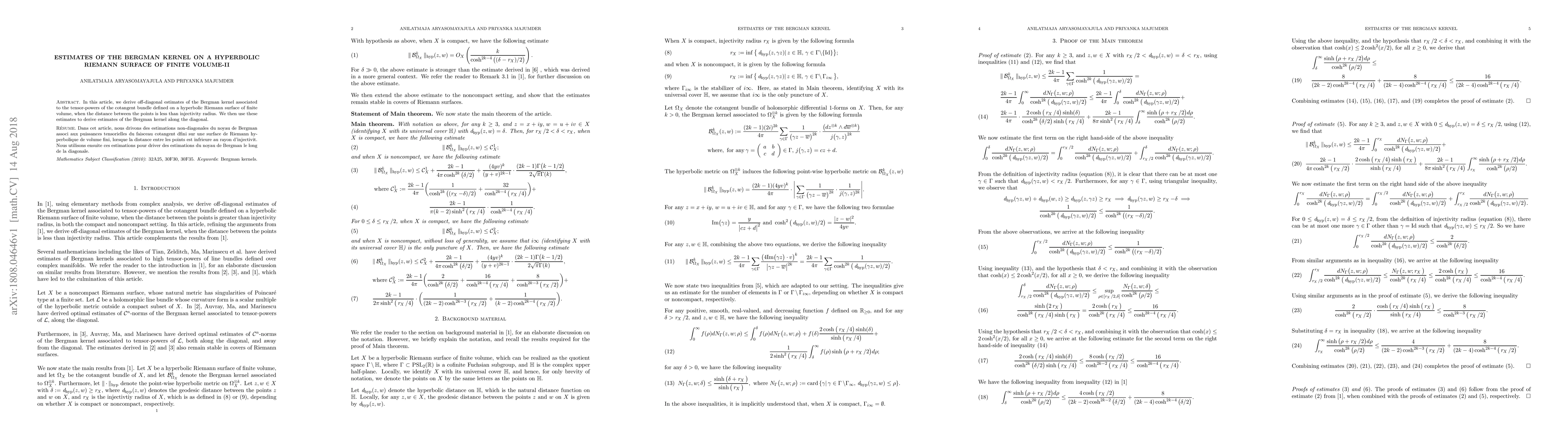 This paper derives off-diagonal estimates for the Bergman kernel on a hyperbolic Riemann surface of finite volume, focusing on tensor-powers of the cotangent bundle when point distances are less than the injectivity radius. It then utilizes these estimates to obtain corresponding diagonal kernel estimates.