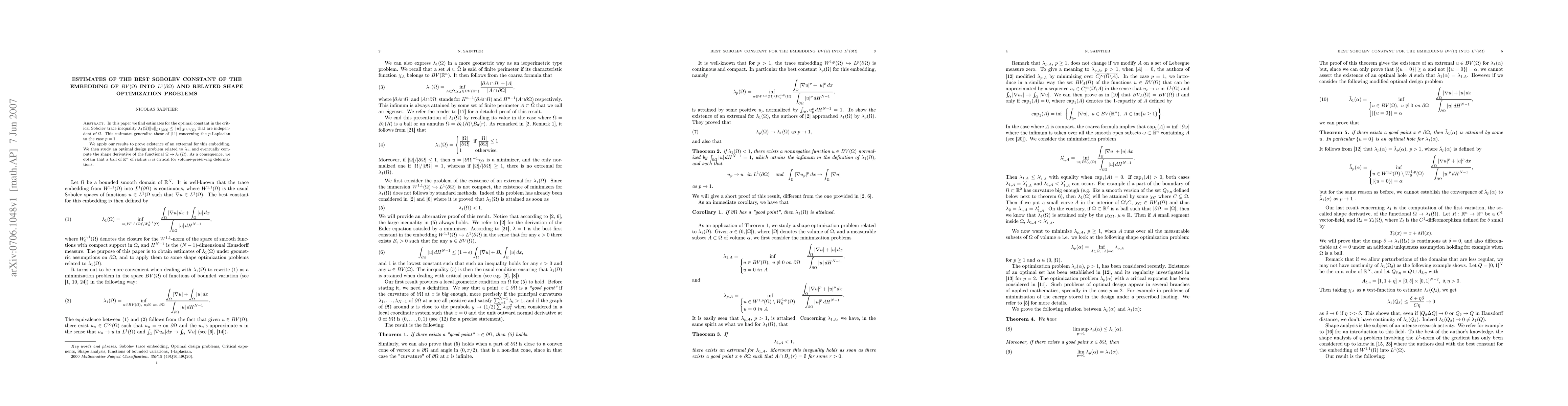 In this paper we find estimates for the optimal constant in the critical Sobolev trace inequality $\lambda_1(\Omega)\|u\|_{L^1(\partial\Omega)} \le \|u\|_{W^{1,1}(\Omega)}$ that are independent of $\Omega$. This estimates generalize those of \cite{BS} concerning the $p$-Laplacian to the case $p=1$. We apply our results to prove existence of an extremal for this embedding. We then study an optimal design problem related to $\lambda_1$, and eventually compute the shape derivative of the functional $\Omega\to\lambda_1(\Omega)$. As a consequence, we obtain that a ball of $\R^n$ of radius $n$ is critical for volume-preserving deformations.