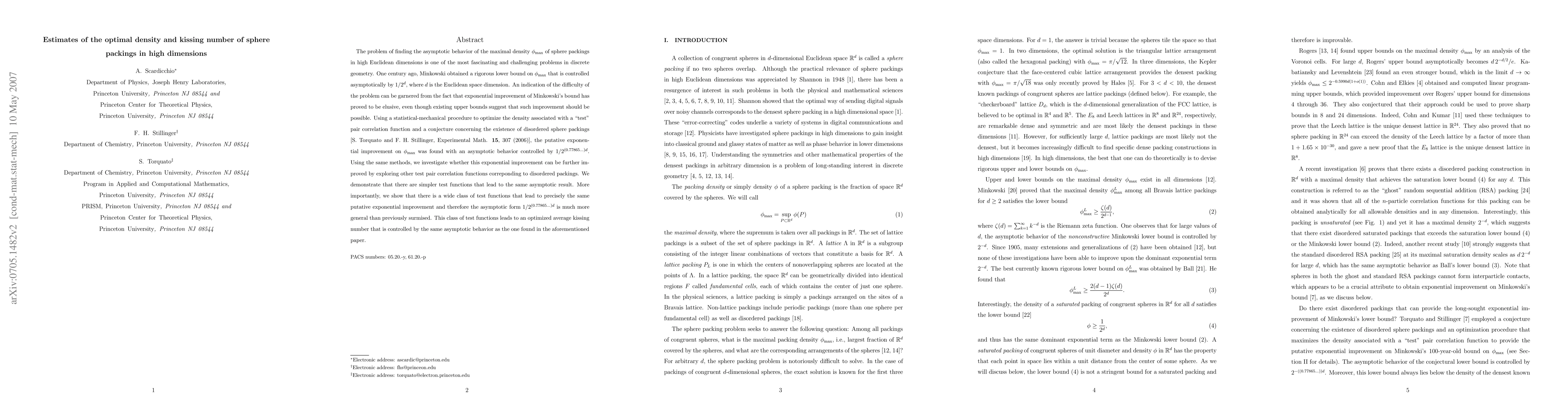 This research refines the estimate of the optimal density in high-dimensional sphere packings, previously conjectured to follow $1/2^d$. It utilizes statistical-mechanical methods and discovers that the density's asymptotic behavior is indeed exponentially improved, controlled by $1/2^{(0.77865...)d}$, and this result is shown to be robust under a wide class of test functions, making the estimate more generally applicable.