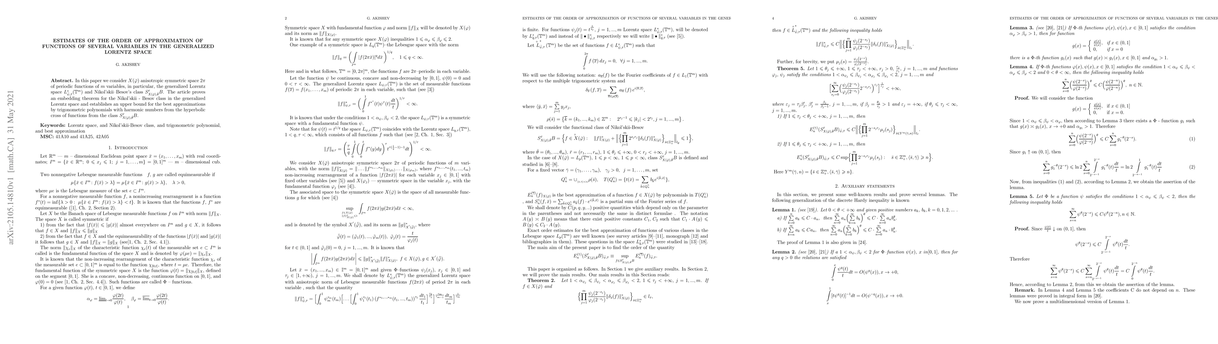 In this paper we consider $ X(\bar\varphi)$ anisotropic symmetric space $ 2\pi$ of periodic functions of $m$ variables, in particular, the generalized Lorentz space $L_{\bar{\psi},\bar{\tau}}^{*}(\mathbb{T}^{m})$ and Nikol'skii--Besov's class $S_{X(\bar{\varphi}),\bar{\theta}}^{\bar r}B$. The article proves an embedding theorem for the Nikol'skii - Besov class in the generalized Lorentz space and establishes an upper bound for the best approximations by trigonometric polynomials with harmonic numbers from the hyperbolic cross of functions from the class $S_{X(\bar{\varphi}),\bar{\theta}}^{\bar r}B$.