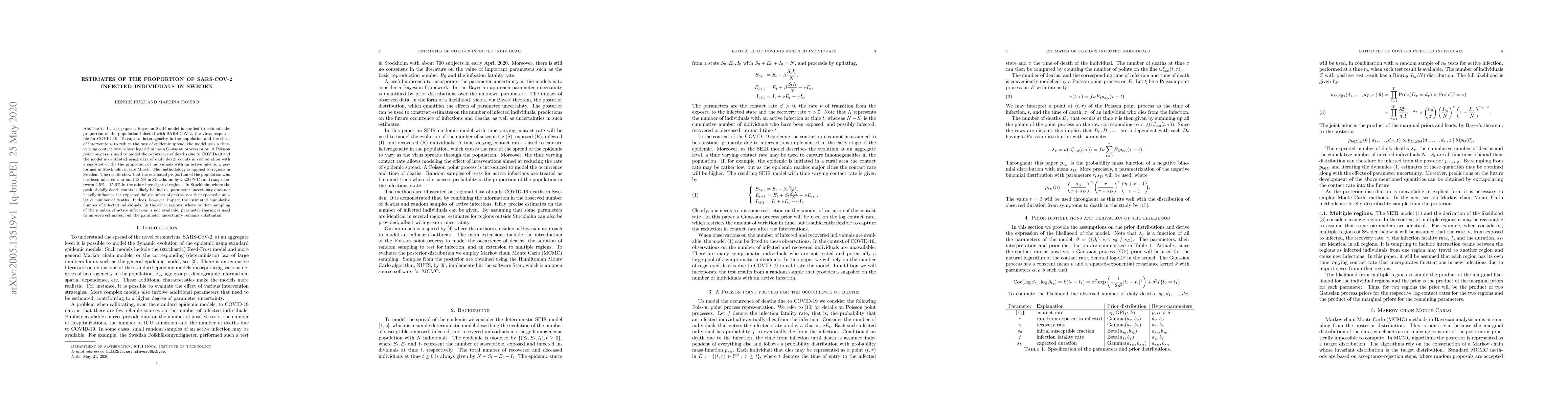In this paper a Bayesian SEIR model is studied to estimate the proportion of the population infected with SARS-CoV-2, the virus responsible for COVID-19. To capture heterogeneity in the population and the effect of interventions to reduce the rate of epidemic spread, the model uses a time-varying contact rate, whose logarithm has a Gaussian process prior. A Poisson point process is used to model the occurrence of deaths due to COVID-19 and the model is calibrated using data of daily death counts in combination with a snapshot of the the proportion of individuals with an active infection, performed in Stockholm in late March. The methodology is applied to regions in Sweden. The results show that the estimated proportion of the population who has been infected is around 13.5% in Stockholm, by 2020-05-15, and ranges between 2.5% - 15.6% in the other investigated regions. In Stockholm where the peak of daily death counts is likely behind us, parameter uncertainty does not heavily influence the expected daily number of deaths, nor the expected cumulative number of deaths. It does, however, impact the estimated cumulative number of infected individuals. In the other regions, where random sampling of the number of active infections is not available, parameter sharing is used to improve estimates, but the parameter uncertainty remains substantial.