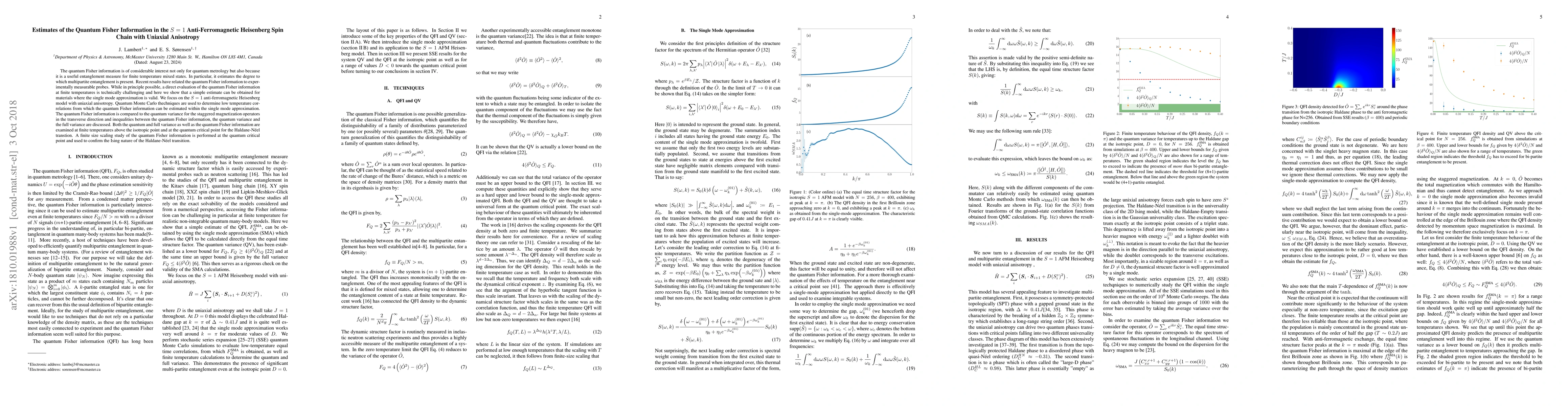 The quantum Fisher information is of considerable interest not only for quantum metrology but also because it is a useful entanglement measure for finite temperature mixed states. In particular, it estimates the degree to which multipartite entanglement is present. Recent results have related the quantum Fisher information to experimentally measurable probes. While in principle possible, a direct evaluation of the quantum Fisher information at finite temperatures is technically challenging and here we show that a simple estimate can be obtained for materials where the single mode approximation is valid. We focus on the $S=1$ anti-ferromagnetic Heisenberg model with uniaxial anisotropy. Quantum Monte Carlo thechniques are used to determine low temperature correlations from which the quantum Fisher information can be estimated within the single mode approximation. The quantum Fisher information is compared to the quantum variance for the staggered magnetization operators in the transverse direction and inequalities between the quantum Fisher information, the quantum variance and the full variance are discussed. Both the quantum and full variance as well as the quantum Fisher information are examined at finite temperatures above the isotropic point and at the quantum critical point for the Haldane-N\'{e}el transtion. A finite size scaling study of the quantum Fisher information is performed at the quantum critical point and used to confirm the Ising nature of the Haldane-N\'{e}el transition.