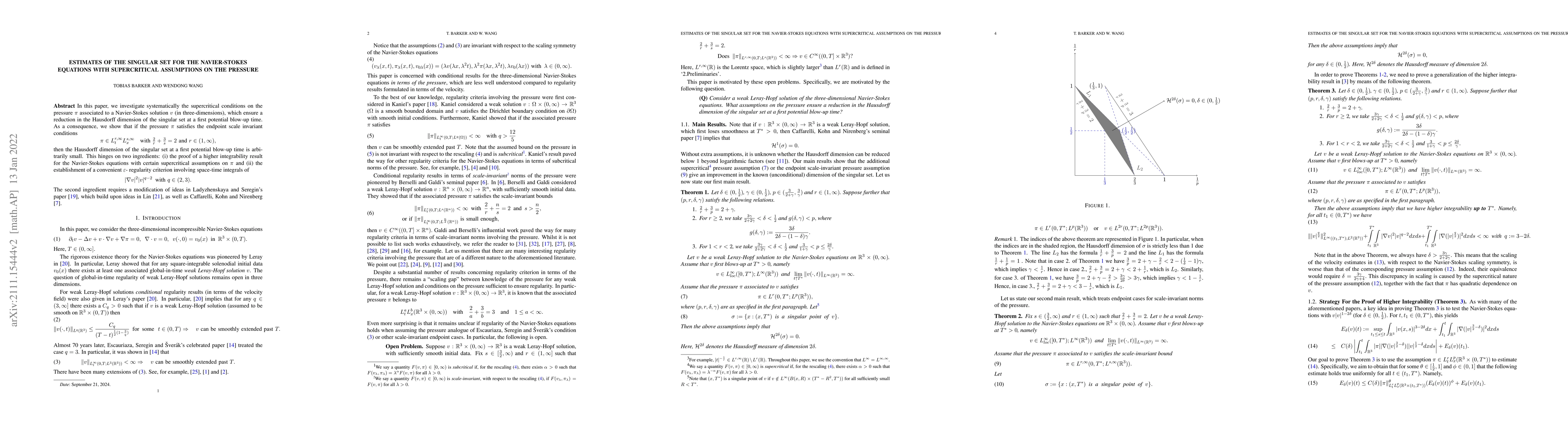 In this paper, we investigate systematically the supercritical conditions on the pressure $\pi$ associated to a Navier-Stokes solution $v$ (in three-dimensions), which ensure a reduction in the Hausdorff dimension of the singular set at a first potential blow-up time. As a consequence, we show that if the pressure $\pi$ satisfies the endpoint scale invariant conditions $$\pi\in L^{r,\infty}_{t}L^{s,\infty}_{x}\quad\textrm{with}\,\,\tfrac{2}{r}+\tfrac{3}{s}=2\,\,\textrm{and}\,\,r\in (1,\infty),$$ then the Hausdorff dimension of the singular set at a first potential blow-up time is arbitrarily small. This hinges on two ingredients: (i) the proof of a higher integrability result for the Navier-Stokes equations with certain supercritical assumptions on $\pi$ and (ii) the establishment of a convenient $\varepsilon$- regularity criterion involving space-time integrals of $$|\nabla v|^2|v|^{q-2}\,\,\,\textrm{with}\,\,q\in (2,3). $$ The second ingredient requires a modification of ideas in Ladyzhenskaya and Seregin's paper, which build upon ideas in Lin, as well as Caffarelli, Kohn and Nirenberg.