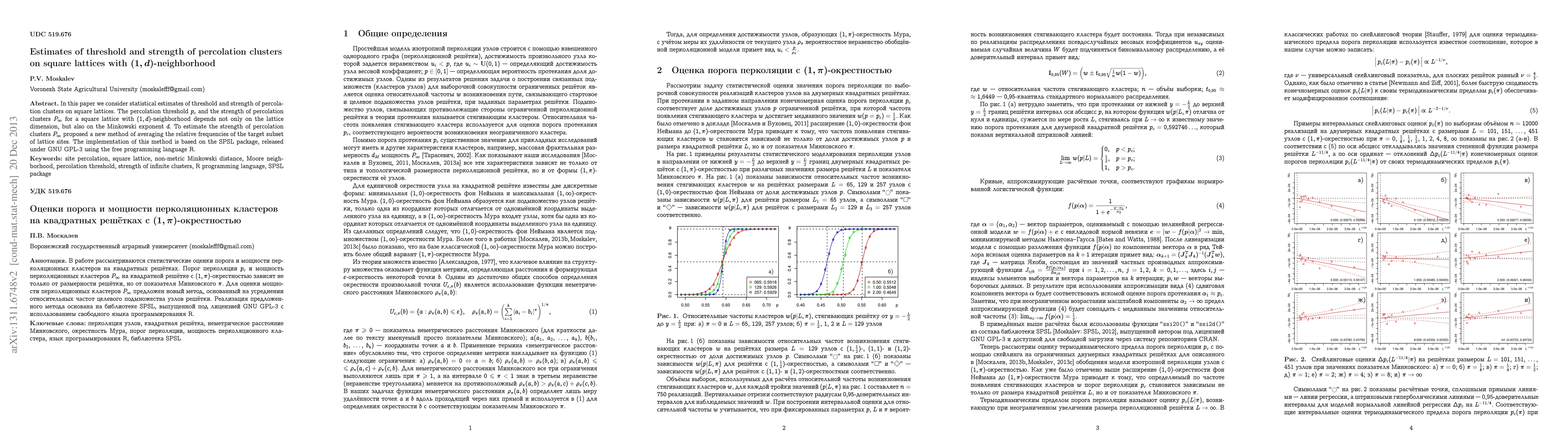 In this paper we consider statistical estimates of threshold and strength of percolation clusters on square lattices. The percolation threshold $p_c$ and the strength of percolation clusters $P_\infty$ for a square lattice with $(1, d)$-neighborhood depends not only on the lattice dimension, but also on the Minkowski exponent $d$. To estimate the strength of percolation clusters $P_\infty$ proposed a new method of averaging the relative frequencies of the target subset of lattice sites. The implementation of this method is based on the SPSL package, released under GNU GPL-3 using the free programming language R.