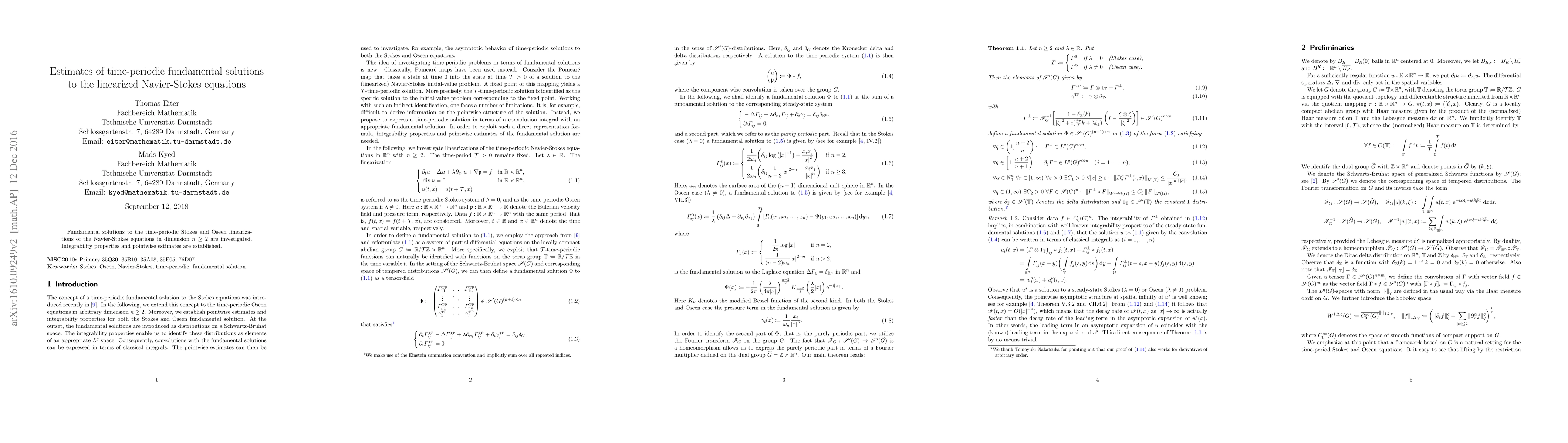 Fundamental solutions to the time-periodic Stokes and Oseen linearizations of the Navier-Stokes equations in dimension $n\geq 2$ are investigated. Integrability properties and pointwise estimates are established.