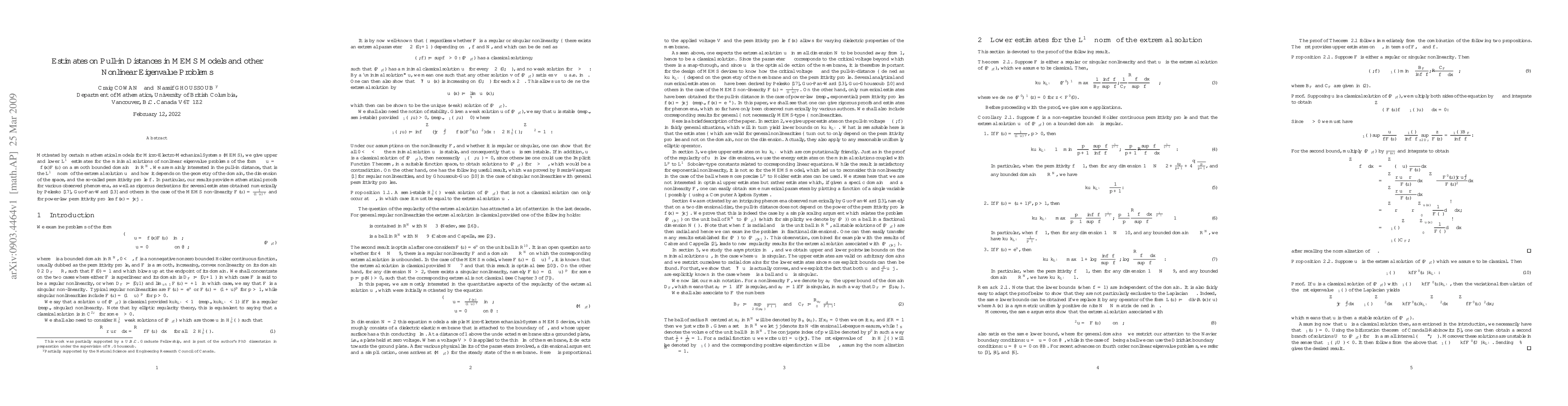 Motivated by certain mathematical models for Micro-Electro-Mechanical Systems (MEMS), we give upper and lower $L^\infty$ estimates for the minimal solutions of nonlinear eigenvalue problems of the form $-\Delta u = \lambda f(x) F(u)$ on a smooth bounded domain $ \Omega$ in $\IR^N$. We are mainly interested in the {\it pull-in distance}, that is the $L^\infty-$norm of the extremal solution $u^*$ and how it depends on the geometry of the domain, the dimension of the space, and the so-called {\it permittivity profile} $f$. In particular, our results provide mathematical proofs for various observed phenomena, as well as rigorous derivations for several estimates obtained numerically by Pelesko \cite{P}, Guo-Pan-Ward \cite{GPW} and others in the case of the MEMS non-linearity $F(u)=\frac{1}{(1-u)^2}$ and for power-law permittivity profiles $f(x)=|x|^\alpha$.