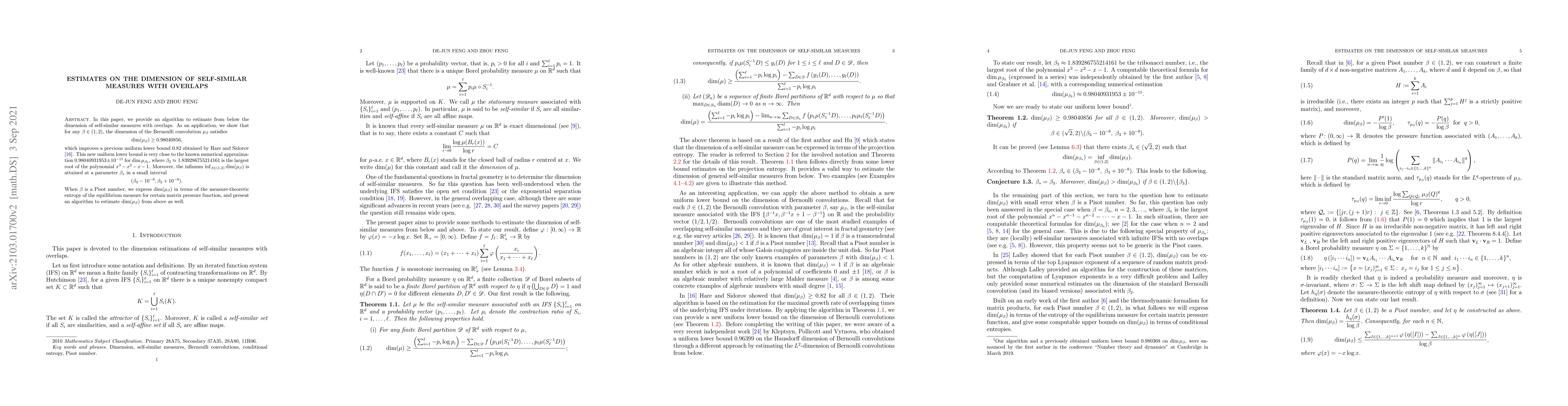 The paper presents an algorithm to estimate from below the dimension of self-similar measures with overlaps, improving a previous lower bound for the Bernoulli convolution and showing that its dimension is at least 0.9804085 for certain parameter values.