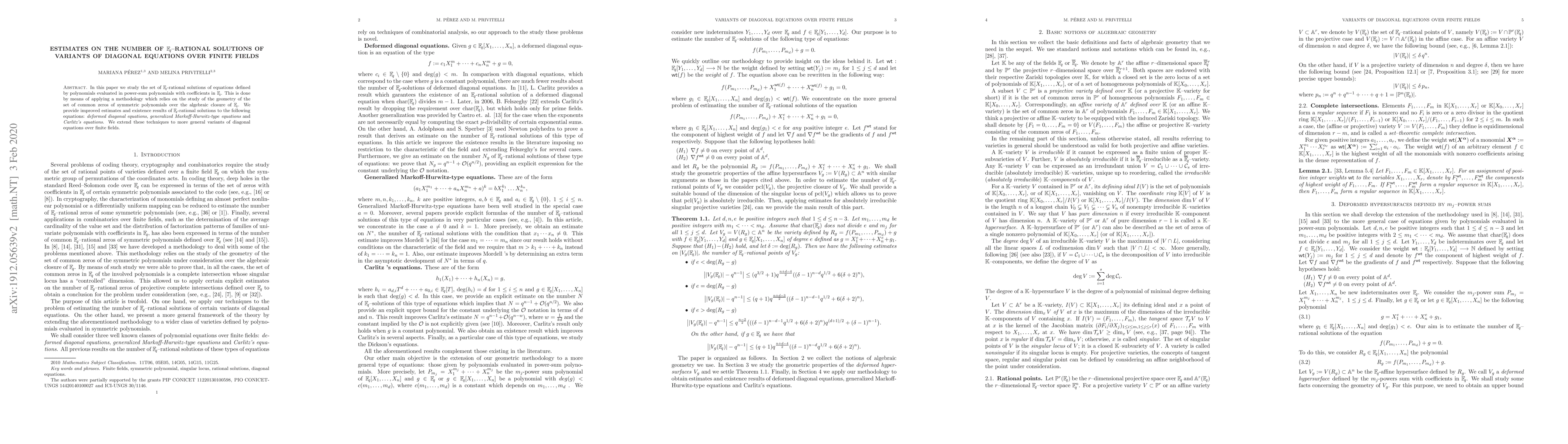 This paper investigates rational solutions of symmetric polynomial equations over finite fields, using geometric methods to provide improved estimates and existence results for deformed diagonal, generalized Markoff Hurwitz, and Carlitz's equations, extending these techniques to broader variants of diagonal equations.