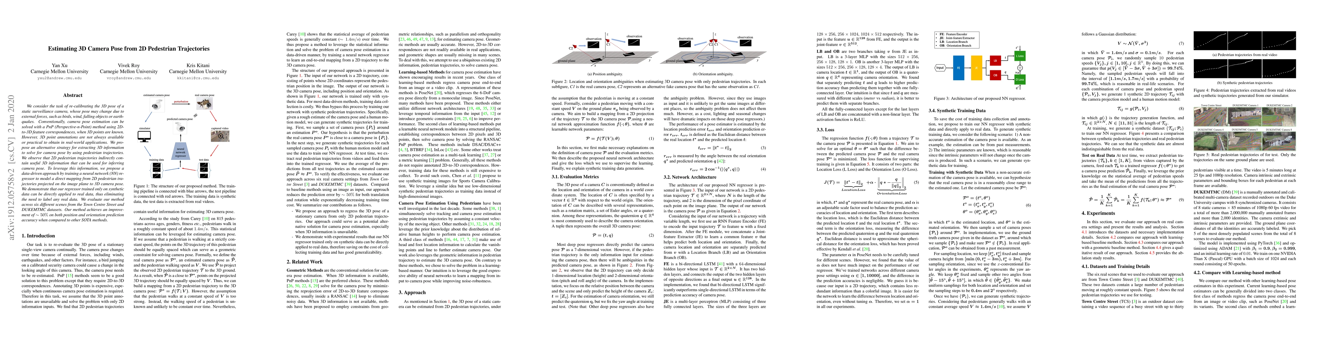 This paper proposes a neural network-based method to estimate the 3D camera pose from 2D pedestrian trajectories, eliminating the need for 3D point annotations. The method leverages synthetic data to train a regressor that maps 2D pedestrian paths to 3D camera pose, achieving a $\sim50\%$ improvement in accuracy over state-of-the-art methods.
