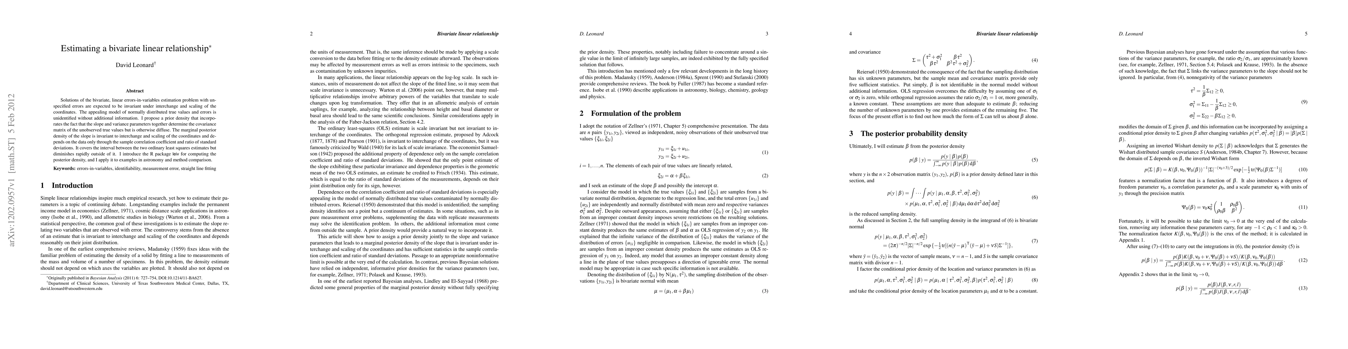 Solutions of the bivariate, linear errors-in-variables estimation problem with unspecified errors are expected to be invariant under interchange and scaling of the coordinates. The appealing model of normally distributed true values and errors is unidentified without additional information. I propose a prior density that incorporates the fact that the slope and variance parameters together determine the covariance matrix of the unobserved true values but is otherwise diffuse. The marginal posterior density of the slope is invariant to interchange and scaling of the coordinates and depends on the data only through the sample correlation coefficient and ratio of standard deviations. It covers the interval between the two ordinary least squares estimates but diminishes rapidly outside of it. I introduce the R package leiv for computing the posterior density, and I apply it to examples in astronomy and method comparison.