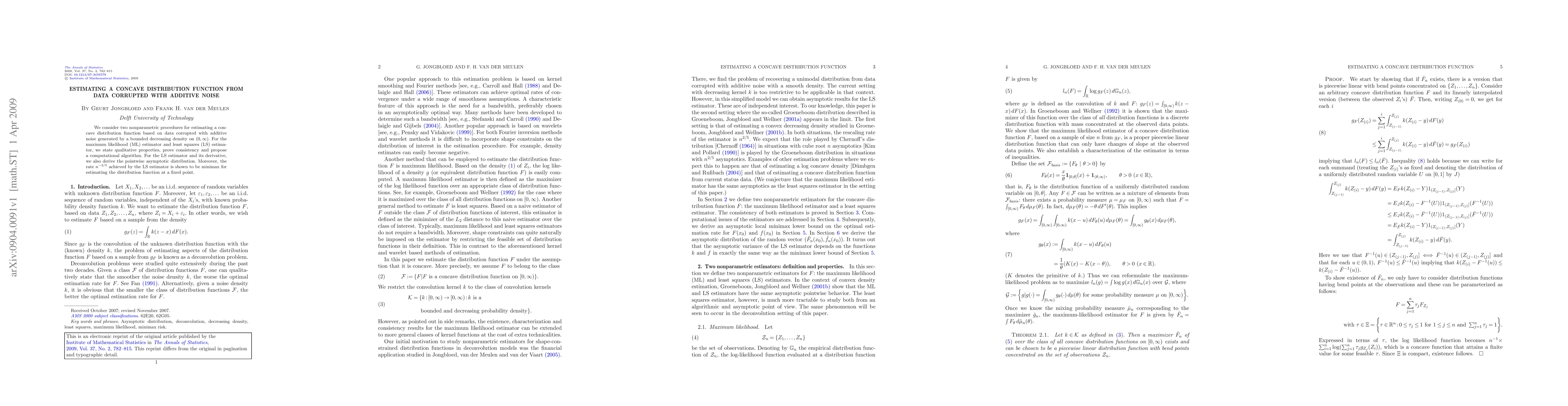 Researchers develop nonparametric procedures to estimate a concave distribution function from data with additive noise, showing consistency and asymptotic properties of the estimators.