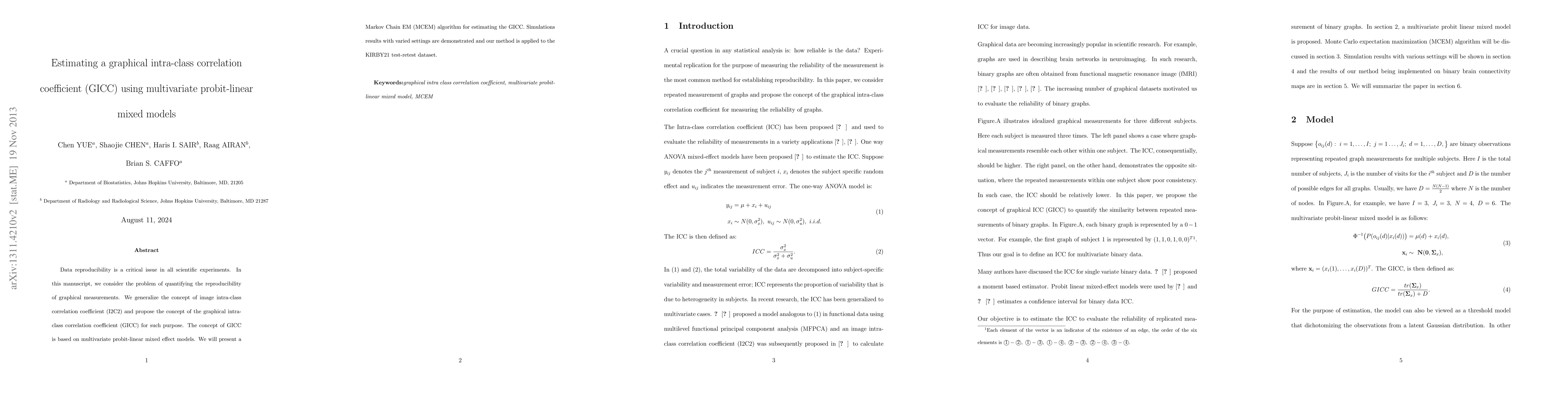 Data reproducibility is a critical issue in all scientific experiments. In this manuscript, we consider the problem of quantifying the reproducibility of graphical measurements. We generalize the concept of image intra-class correlation coefficient (I2C2) and propose the concept of the graphical intra-class correlation coefficient (GICC) for such purpose. The concept of GICC is based on multivariate probit-linear mixed effect models. We will present a Markov Chain EM (MCEM) algorithm for estimating the GICC. Simulations results with varied settings are demonstrated and our method is applied to the KIRBY21 test-retest dataset.