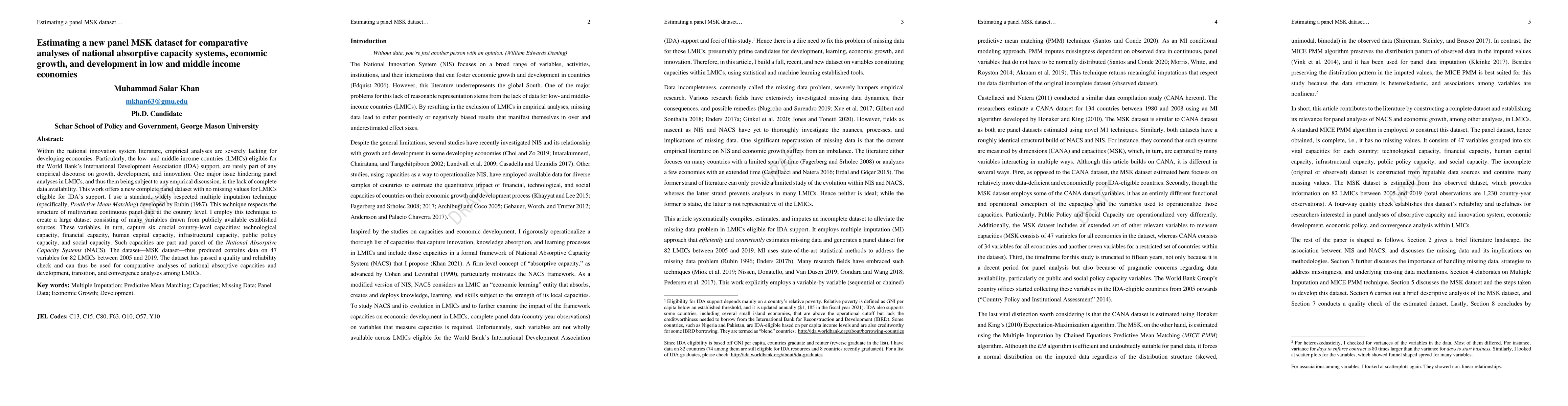 Within the national innovation system literature, empirical analyses are severely lacking for developing economies. Particularly, the low- and middle-income countries (LMICs) eligible for the World Bank's International Development Association (IDA) support, are rarely part of any empirical discourse on growth, development, and innovation. One major issue hindering panel analyses in LMICs, and thus them being subject to any empirical discussion, is the lack of complete data availability. This work offers a new complete panel dataset with no missing values for LMICs eligible for IDA's support. I use a standard, widely respected multiple imputation technique (specifically, Predictive Mean Matching) developed by Rubin (1987). This technique respects the structure of multivariate continuous panel data at the country level. I employ this technique to create a large dataset consisting of many variables drawn from publicly available established sources. These variables, in turn, capture six crucial country-level capacities: technological capacity, financial capacity, human capital capacity, infrastructural capacity, public policy capacity, and social capacity. Such capacities are part and parcel of the National Absorptive Capacity Systems (NACS). The dataset (MSK dataset) thus produced contains data on 47 variables for 82 LMICs between 2005 and 2019. The dataset has passed a quality and reliability check and can thus be used for comparative analyses of national absorptive capacities and development, transition, and convergence analyses among LMICs.