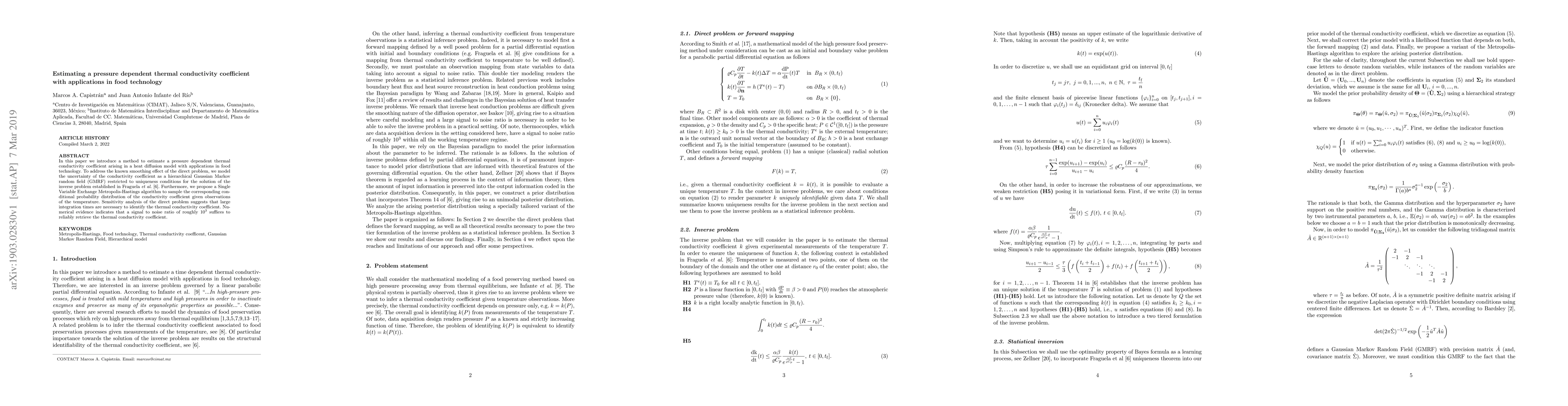This paper presents a method for estimating a pressure-dependent thermal conductivity coefficient in food technology, using a hierarchical Gaussian Markov random field to model uncertainty and a Single Variable Exchange Metropolis-Hastings algorithm to sample the coefficient's distribution. Numerical results suggest large integration times and a signal-to-noise ratio of around 1000 for reliable estimation.