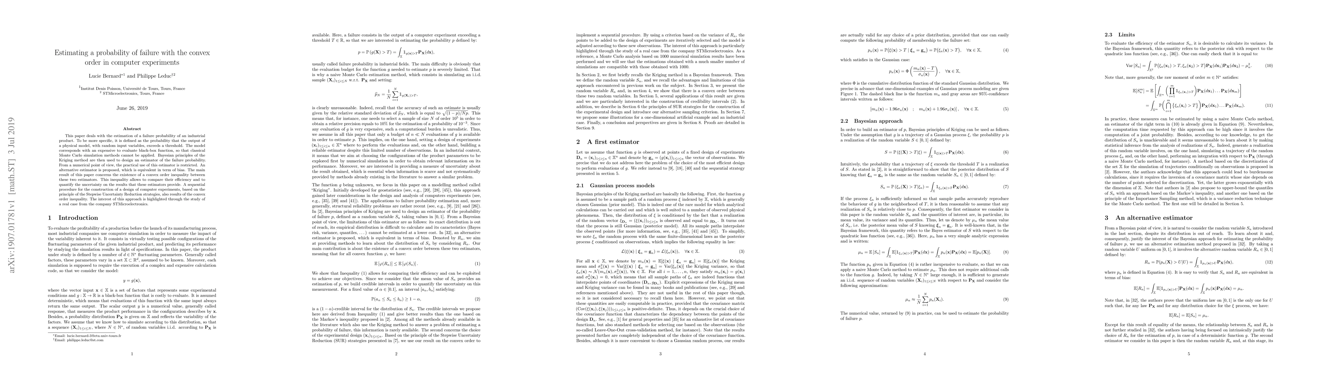 This paper deals with the estimation of a failure probability of an industrial product. To be more specific, it is defined as the probability that the output of a physical model, with random input variables, exceeds a threshold. The model corresponds with an expensive to evaluate black-box function, so that classical Monte Carlo simulation methods cannot be applied. Bayesian principles of the Kriging method are then used to design an estimator of the failure probability. From a numerical point of view, the practical use of this estimator is restricted. An alternative estimator is proposed, which is equivalent in term of bias. The main result of this paper concerns the existence of a convex order inequality between these two estimators. This inequality allows to compare their efficiency and to quantify the uncertainty on the results that these estimators provide. A sequential procedure for the construction of a design of computer experiments, based on the principle of the Stepwise Uncertainty Reduction strategies, also results of the convex order inequality. The interest of this approach is highlighted through the study of a real case from the company STMicroelectronics.