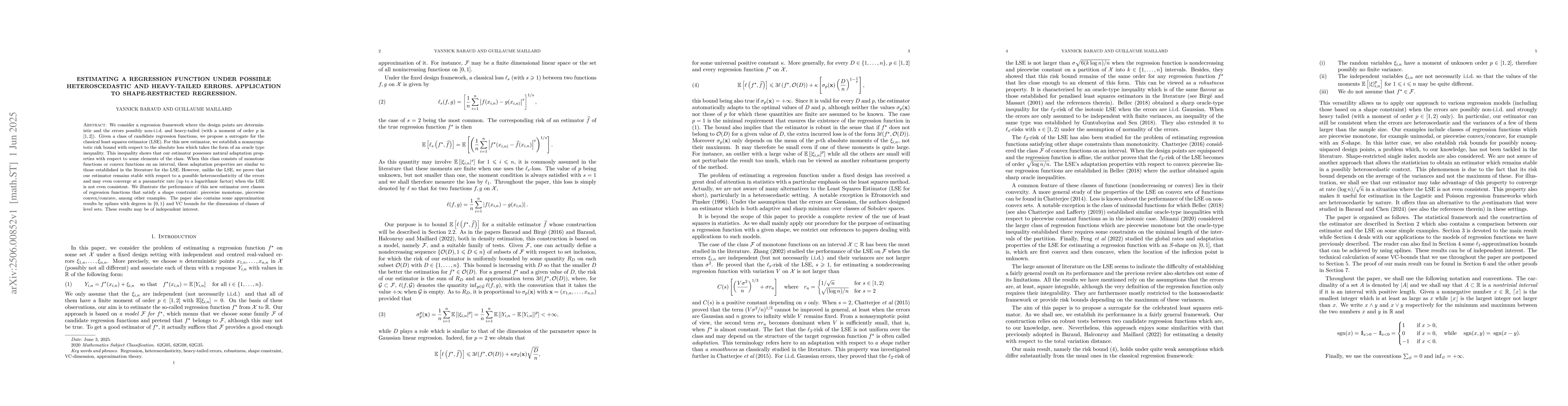 We consider a regression framework where the design points are deterministic and the errors possibly non-i.i.d. and heavy-tailed (with a moment of order $p$ in $[1,2]$). Given a class of candidate regression functions, we propose a surrogate for the classical least squares estimator (LSE). For this new estimator, we establish a nonasymptotic risk bound with respect to the absolute loss which takes the form of an oracle type inequality. This inequality shows that our estimator possesses natural adaptation properties with respect to some elements of the class. When this class consists of monotone functions or convex functions on an interval, these adaptation properties are similar to those established in the literature for the LSE. However, unlike the LSE, we prove that our estimator remains stable with respect to a possible heteroscedasticity of the errors and may even converge at a parametric rate (up to a logarithmic factor) when the LSE is not even consistent. We illustrate the performance of this new estimator over classes of regression functions that satisfy a shape constraint: piecewise monotone, piecewise convex/concave, among other examples. The paper also contains some approximation results by splines with degrees in $\{0,1\}$ and VC bounds for the dimensions of classes of level sets. These results may be of independent interest.