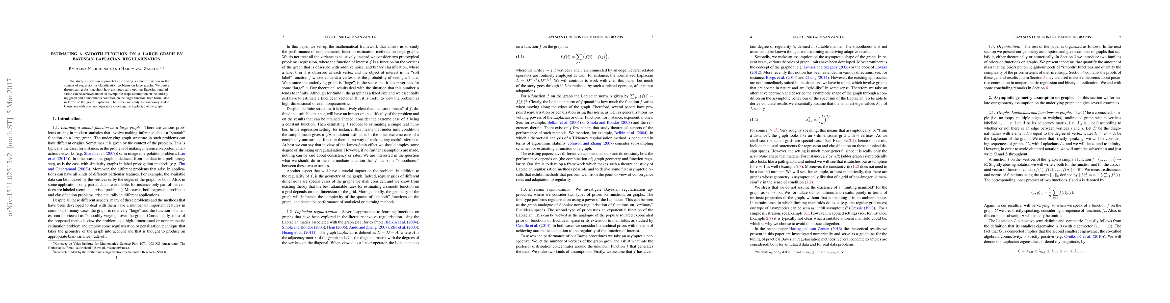 This paper proposes a Bayesian method for estimating smooth functions on large graphs using Laplacian regularization. It provides theoretical results demonstrating optimal regularization under assumptions on graph structure and function smoothness, utilizing priors based on scaled Gaussians and graph Laplacian precision operators.
