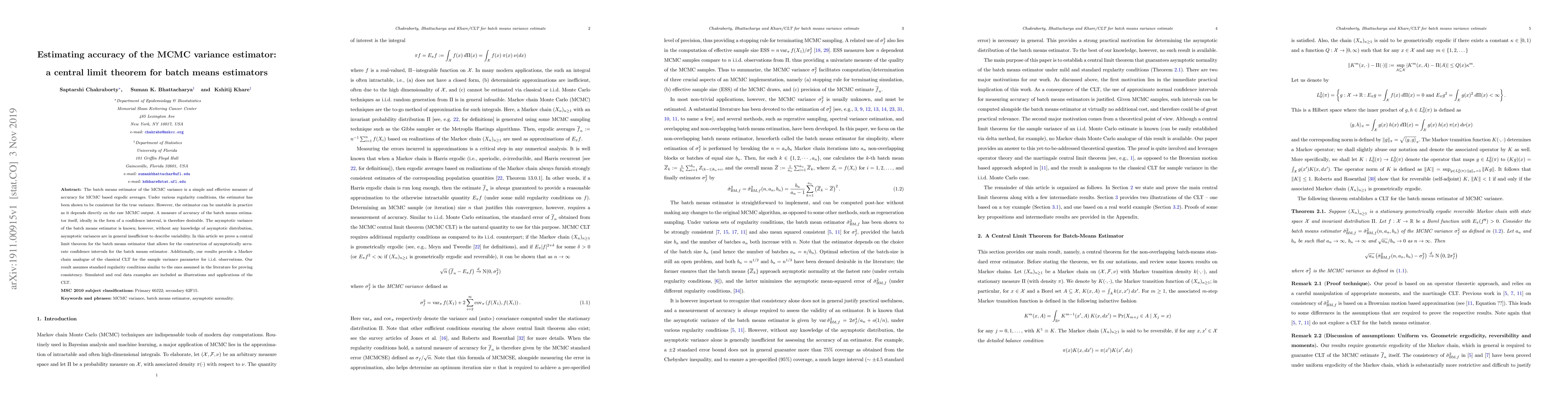 This paper proves a central limit theorem for the batch means estimator used in MCMC methods, enabling the construction of asymptotically accurate confidence intervals for the estimator. It also provides a Markov chain analogue of the classical central limit theorem for sample variance.