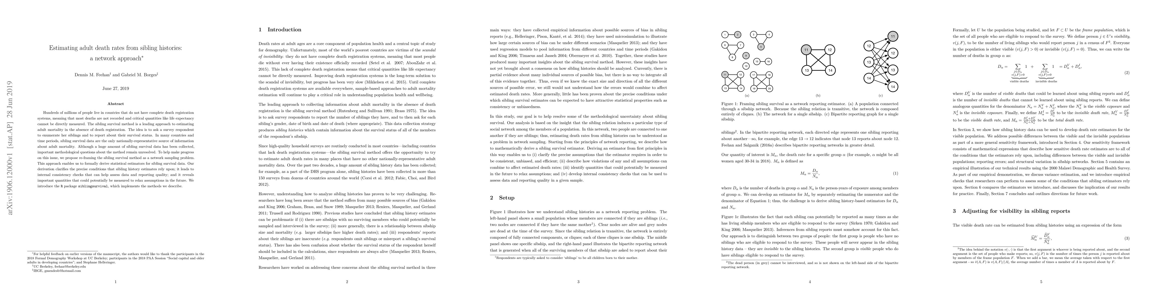 This paper proposes a network approach to estimate adult mortality rates using sibling survival data, addressing unresolved methodological questions. It introduces statistical estimators for sibling survival data and provides an R package for implementation.