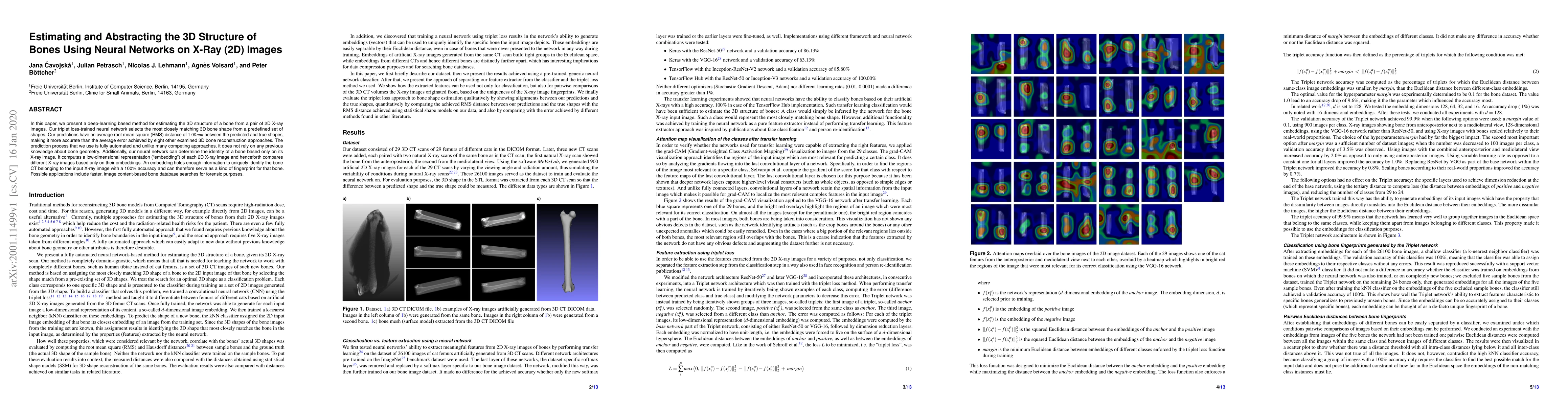 In this paper, we present a deep-learning based method for estimating the 3D structure of a bone from a pair of 2D X-ray images. Our triplet loss-trained neural network selects the most closely matching 3D bone shape from a predefined set of shapes. Our predictions have an average root mean square (RMS) distance of 1.08 mm between the predicted and true shapes, making it more accurate than the average error achieved by eight other examined 3D bone reconstruction approaches. The prediction process that we use is fully automated and unlike many competing approaches, it does not rely on any previous knowledge about bone geometry. Additionally, our neural network can determine the identity of a bone based only on its X-ray image. It computes a low-dimensional representation ("embedding") of each 2D X-ray image and henceforth compares different X-ray images based only on their embeddings. An embedding holds enough information to uniquely identify the bone CT belonging to the input X-ray image with a 100% accuracy and can therefore serve as a kind of fingerprint for that bone. Possible applications include faster, image content-based bone database searches for forensic purposes.