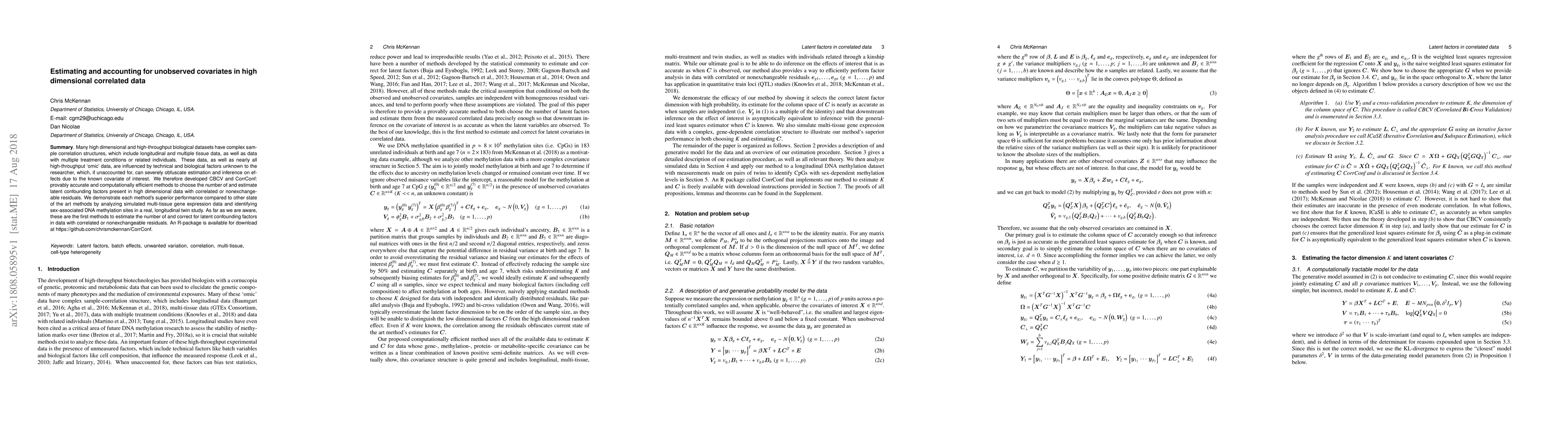 Many high dimensional and high-throughput biological datasets have complex sample correlation structures, which include longitudinal and multiple tissue data, as well as data with multiple treatment conditions or related individuals. These data, as well as nearly all high-throughput `omic' data, are influenced by technical and biological factors unknown to the researcher, which, if unaccounted for, can severely obfuscate estimation and inference on effects due to the known covariate of interest. We therefore developed CBCV and CorrConf: provably accurate and computationally efficient methods to choose the number of and estimate latent confounding factors present in high dimensional data with correlated or nonexchangeable residuals. We demonstrate each method's superior performance compared to other state of the art methods by analyzing simulated multi-tissue gene expression data and identifying sex-associated DNA methylation sites in a real, longitudinal twin study. As far as we are aware, these are the first methods to estimate the number of and correct for latent confounding factors in data with correlated or nonexchangeable residuals. An R-package is available for download at https://github.com/chrismckennan/CorrConf.