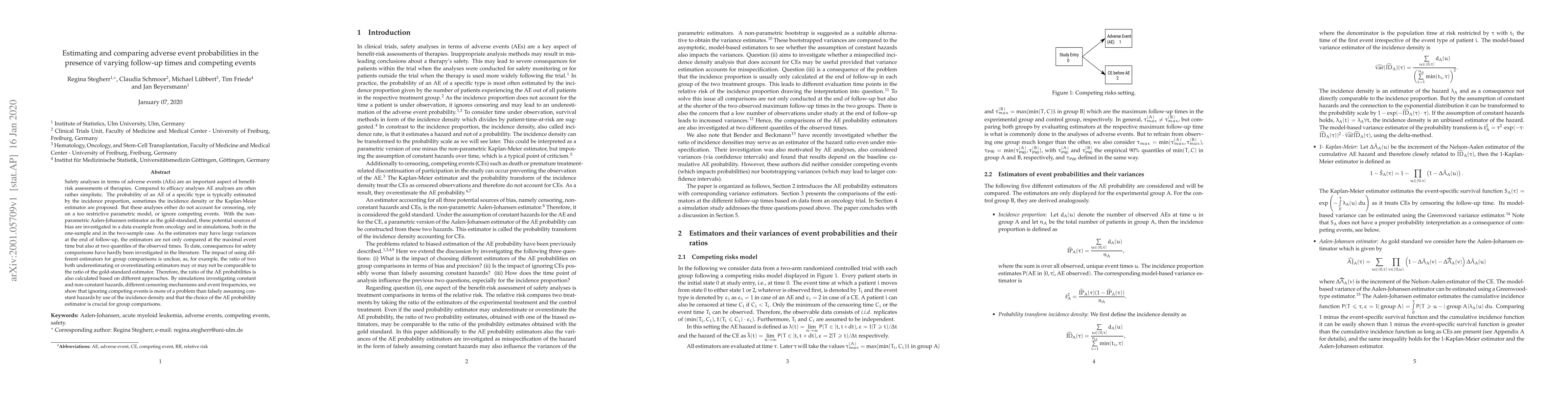 This paper investigates the estimation of adverse event probabilities in the presence of varying follow-up times and competing events, proposing the non-parametric Aalen-Johansen estimator as a gold-standard. It highlights the biases in simpler estimators and demonstrates through simulations and a real data example that the choice of estimator significantly impacts safety comparisons, especially when competing events are not accounted for.