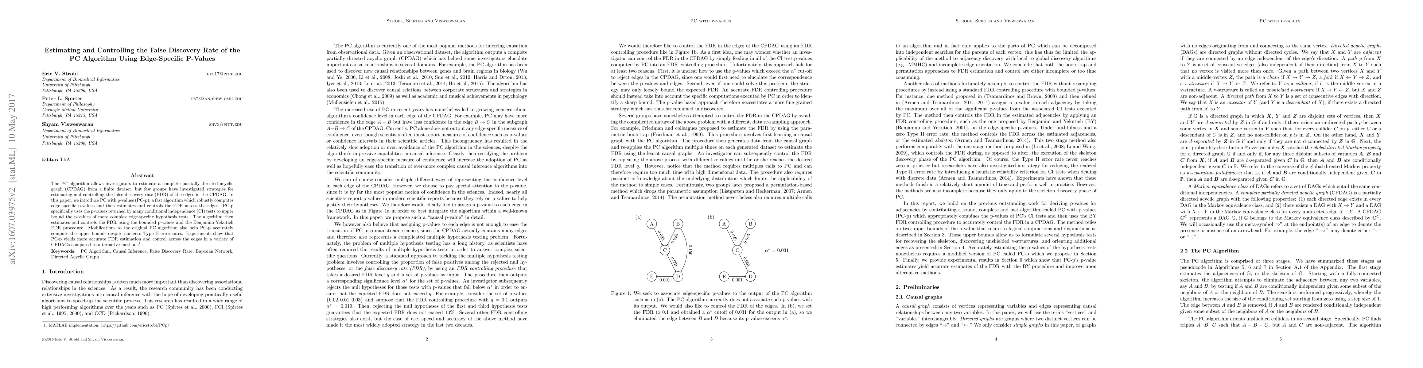 This paper introduces PC-p, an algorithm for estimating and controlling the false discovery rate (FDR) in the PC algorithm by computing edge-specific p-values and using the Benjamini-Yekutieli procedure. Experiments demonstrate that PC-p provides more accurate FDR estimation and control compared to alternative methods.